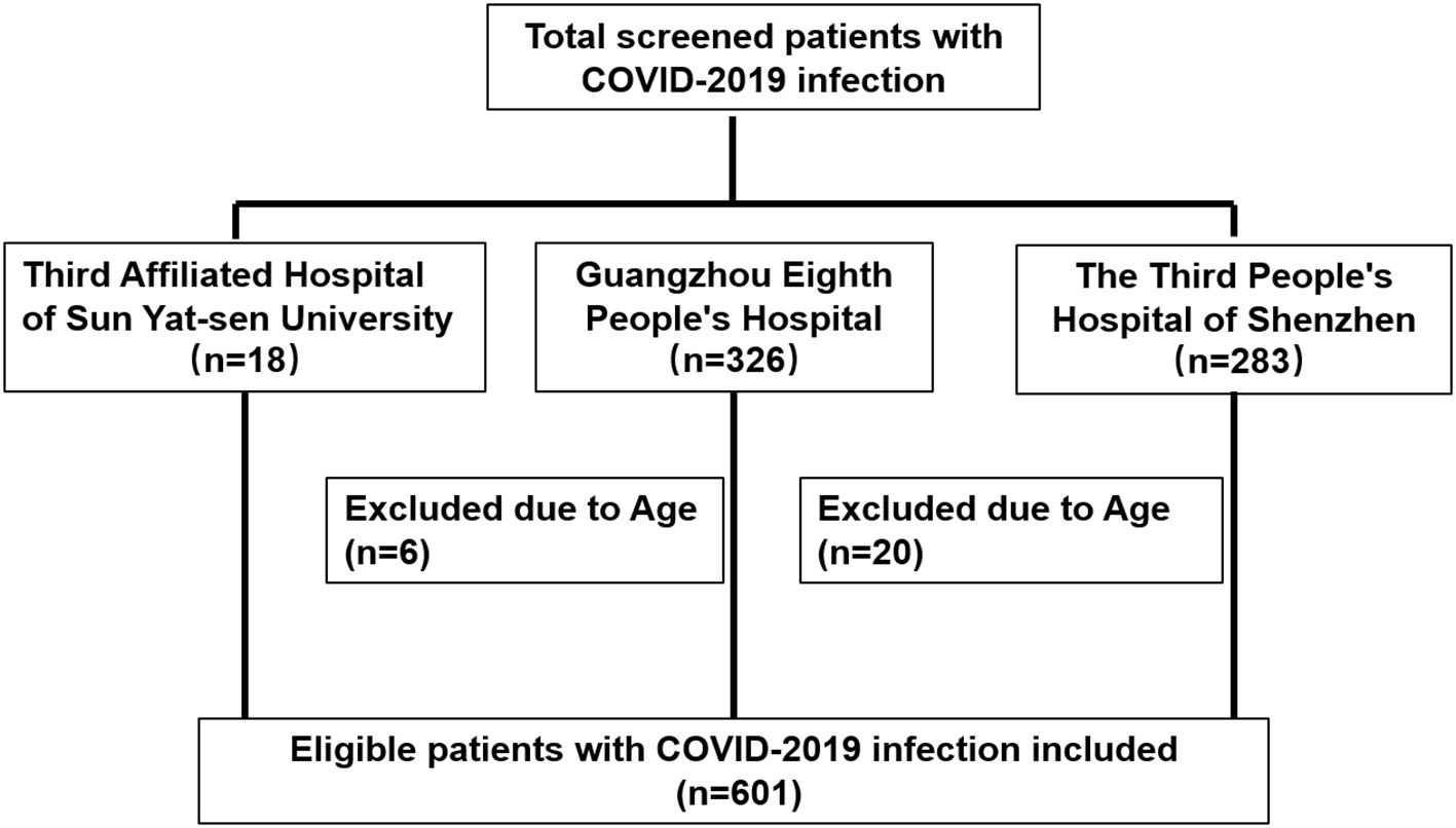 The data of 601 patients with laboratory-confirmed COVID-19, admitted to the Third Affiliated Hospital of Sun Yat-sen University, Guangzhou Eighth People's Hospital and The Third People's Hospital of Shenzhen from January 20, 2020, to April 25, 2020, were retrospectively analyzed. All included patients were medically observed at least 15 days after admission to determine whether they progressed to severe COVID-19 (severe group) or non-severe COVID-19 (non-severe group). Diagnostic criteria for SARS-CoV-2 infection have been described previously in a previous study (12). The diagnosis of severe COVID-19 was based on the Guidelines for Diagnosis and Treatment of Novel Coronavirus Pneumonia (6th version) released by the National Health Commission of China. Severe cases should meet at least one of the following criteria: (1) shortness of breath, respiratory rate (RR) ≥30 times/min; (2) arterial oxygen saturation (resting status) ≤ 93%; or (3) the ratio of partial pressure of oxygen to fraction of inspiration O2(PaO2/FiO2) ≤ 300 mmHg. Critical cases of COVID-19 should meet any of the following criteria: (1) respiratory failure requiring mechanical ventilation, (2) shock, and (3) with other organ failure that requires ICU care.