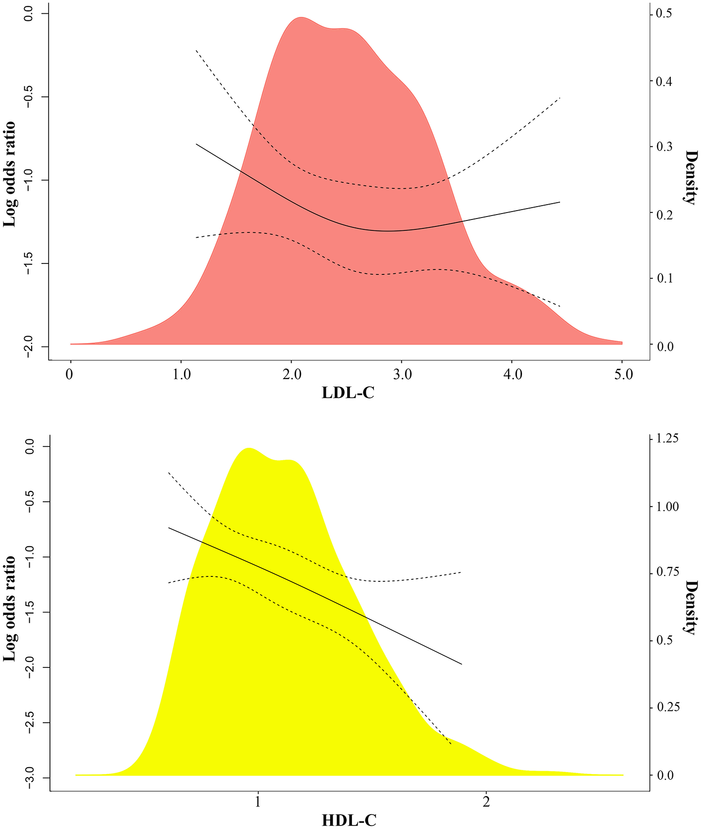 Association between LDL-C, HDL-C, and severe COVID-19 using restricted cubic splines. (A) LDL-C and HDL-C on a continuous scale and risk of severe COVID-19 in 601 patients with SARS-CoV-2. Analyses were conducted using restricted cubic splines. The red and yellow areas indicate the distribution of LDL-C and HDL-C, respectively.