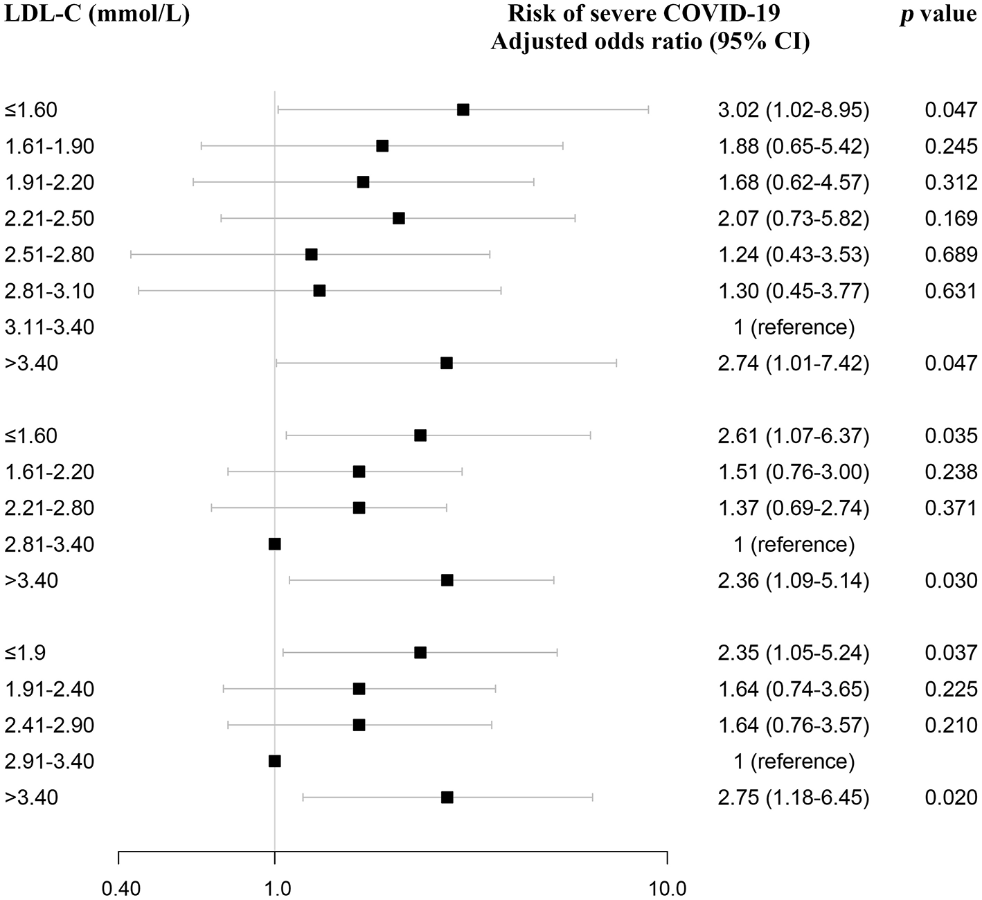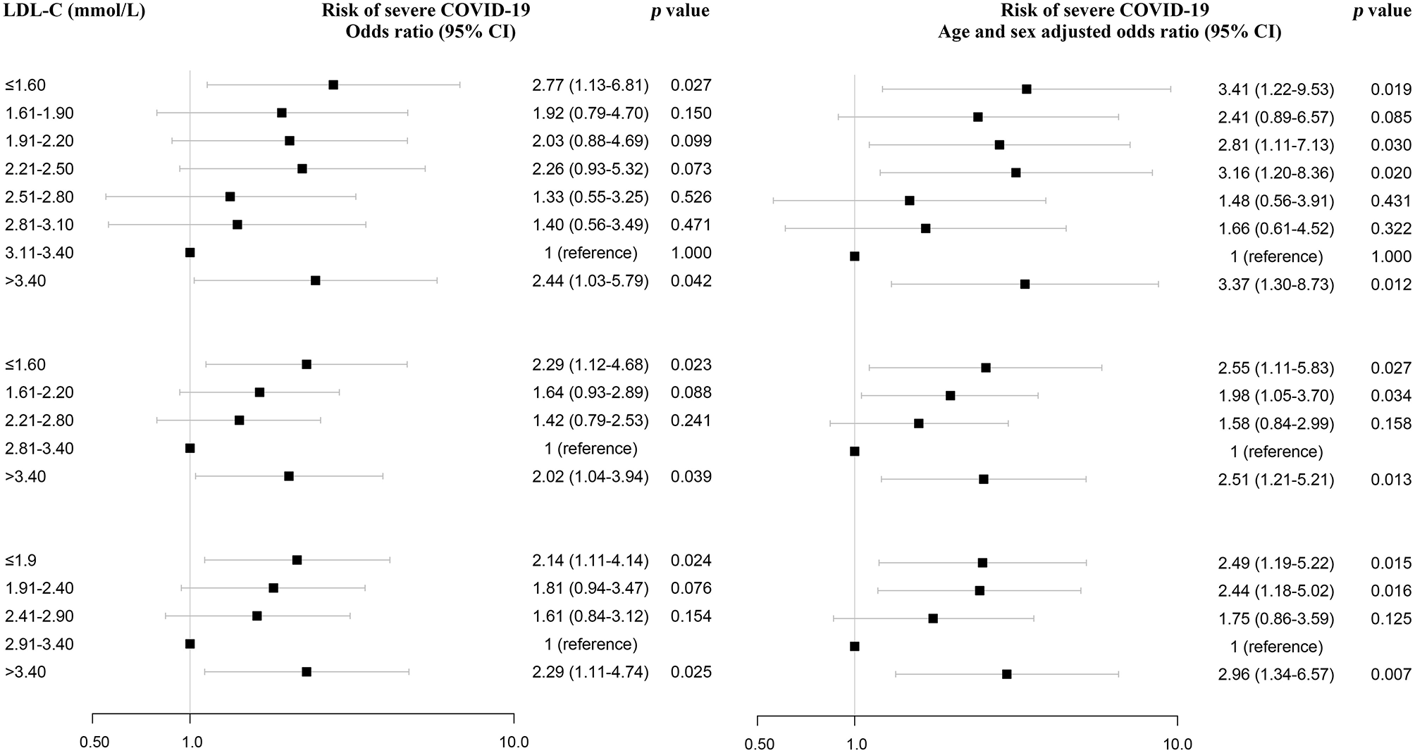 Consistent with the above results, there was an U-shaped association between LDL-C and risk of severe COVID-19 when serum LDL-C levels were divided into 0.6 mmol/L (23.2 mg/dL) intervals and 0.5 mmol/L (19.3 mg/dL) intervals (Figure 3, lower left part). Even after adjusting for age and gender, this association persisted, with an odds ratio for severe COVID-19 of 2.55 (1.11–5.83) for cases with LDL-C ≤1.6 mmol/L (61.9 mg/dL) compared to cases with LDL-C of 2.81–3.40 mmol/L; 108.6–131.4 mg/dL) using 0.6 intervals and 2.49 (1.19–5.22) for cases with LDL-C ≤1.9 mmol/L (73.5 mg/dL) compared to cases with LDL-C of 2.91–3.40 mmol/L (Figure 3, lower right part).