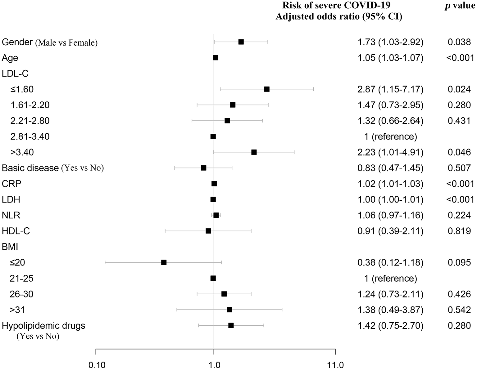 Association between LDL-C and severe COVID-19 using multivariate logistic regression analysis and sensitivity analysis. LDL-C and risk of severe COVID-19 using multivariate logistic regression analysis. After adjusting for age, gender, CRP, LDH, and NLR, odds ratios were from multivariate logistic regression analysis. CRP, C-reactive protein; LDH, lactate dehydrogenase; NLR, neutrophil-to-lymphocyte ratio.