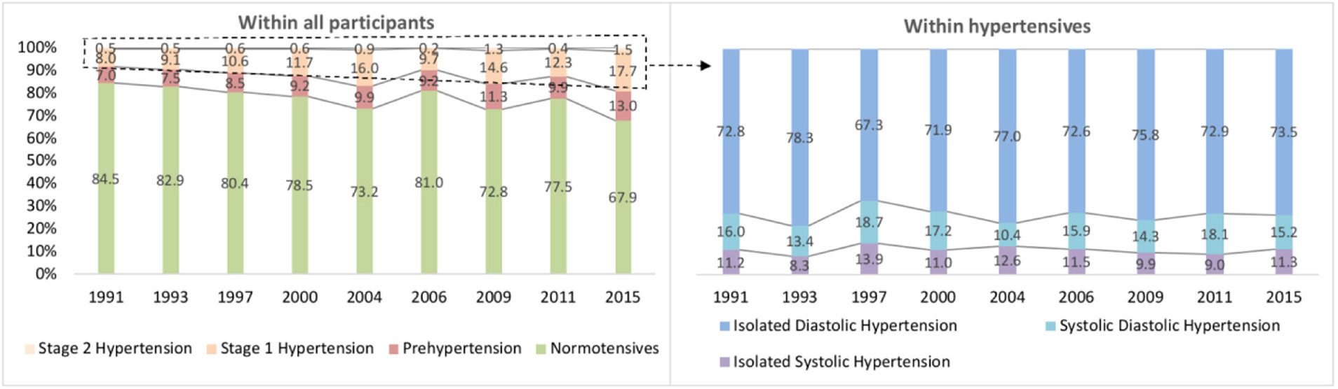 Conclusion: BP levels and prevalence of hypertension and phenotypes increased dramatically in Chinese children and adolescents from 1991 to 2015. Regional discrepancy, demographic features, BMI, WC and overweight/obesity status were associated factors of hypertension among youths.
