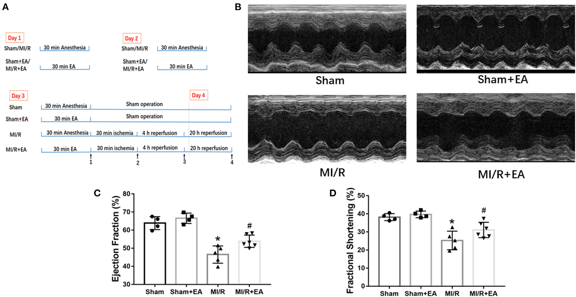 EA pretreatment mitigated MI/R-induced cardiac dysfunction. (A) A schematic illustration of the study groups and in vivo experimental protocols. Time point 1: ischemic phase. Time point 2: reperfusion phase. Time point 3: heart tissue collection for protein analysis. Time point 4: echo analysis and TTC staining. (B) Representative images of M-mode echocardiography in MI/R-induced cardiac injury following EA pretreatment. Images of M-mode echocardiography were recorded from horizontal direction of the heart and then were analyzed to assess cardiac systolic function. (C) Ejection fraction. (D) Fractional shortening. n = 4–6 in each group. EA, electroacupuncture; MI/R, myocardial ischemia/reperfusion; TTC, triphenyltetrazolium chloride. *P < 0.05 vs. Sham group, #P < 0.05 vs. MI/R group.