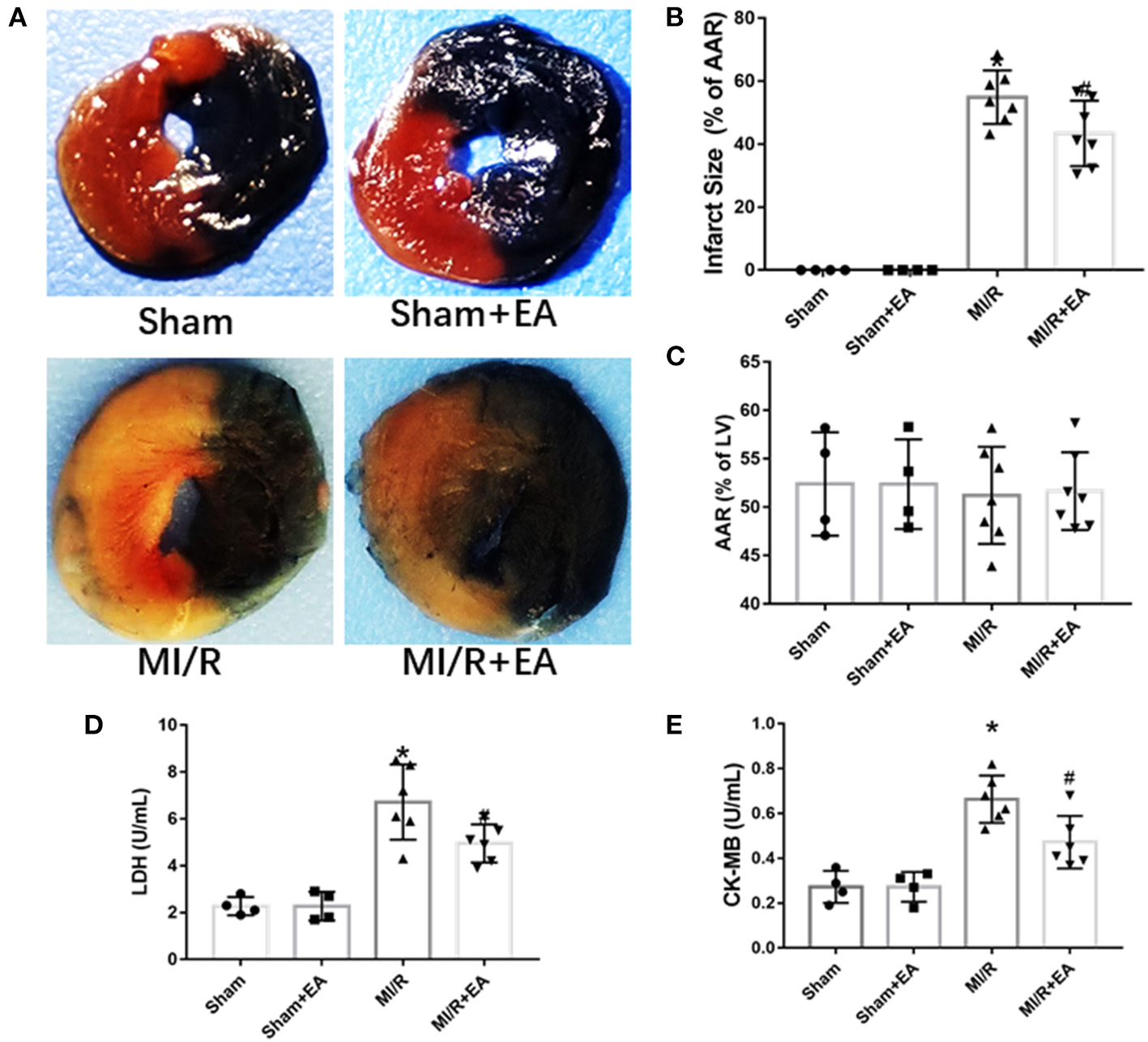 The effects of EA pretreatment on myocardial infarct size, LDH, and CK-MB activities in MI/R-induced cardiac injury. (A) Representative images of cardiac slices by TTC/Evans blue double staining in MI/R-induced cardiac injury following EA pretreatment. (B) Myocardial infarct size of different groups. (C) Myocardial area at risk (AAR) following MI/R procedure and EA treatment. n = 4–7 in each group for TTC/Evans blue double staining. (D) Serum LDH activity. (E) Serum CK-MB activity. n = 4–6 in each group for enzyme activity measurements. LDH, lactate dehydrogenase; CK-MB, creatine kinase-MB isoform; EA, electroacupuncture; MI/R, myocardial ischemia/reperfusion; TTC, triphenyltetrazolium chloride. *P < 0.05 vs. Sham group, #P < 0.05 vs. MI/R group.