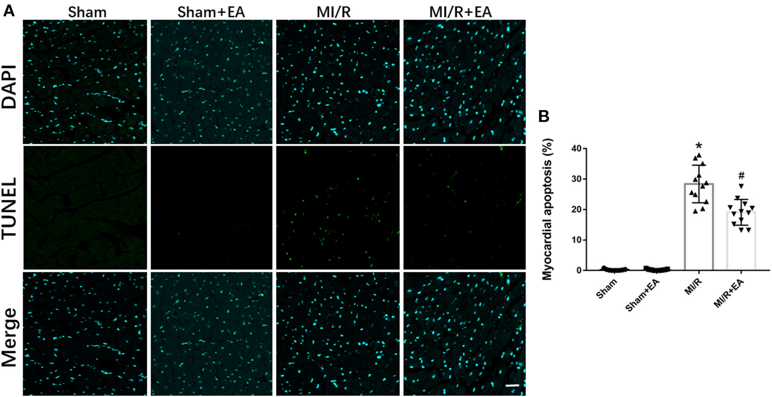 The effects of EA pretreatment on myocardial apoptosis in MI/R-induced cardiac injury. (A) Representative images of myocardial apoptosis by TUNEL staining in MI/R-induced cardiac injury following EA pretreatment. (B) Myocardial apoptosis of mice from different groups. n = 3–4 for each group. Three to four hearts in each group were used for TUNEL staining, and five random fields in three sections of each heart were used for further analysis. Bar, 100 μm. *P < 0.05 vs. Sham group, #P < 0.05 vs. MI/R group. EA, electroacupuncture; MI/R, myocardial ischemia/reperfusion.