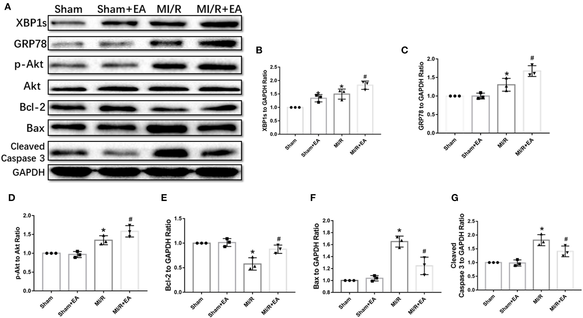 EA pretreatment activated XBP1/GRP78/Akt pathway and reduced apoptotic protein expressions. (A) Representative blot images of proteins related to XBP1/GRP78/Akt and apoptotic signaling pathways. (B–G) The quantitative analysis of XBP1, GRP78, p-Akt, Bcl-2, Bax, and cleaved Caspase 3 protein expressions. n = 3 in each group. *P < 0.05 vs. Sham group, #P < 0.05 vs. MI/R group. EA, electroacupuncture; MI/R, myocardial ischemia/reperfusion.