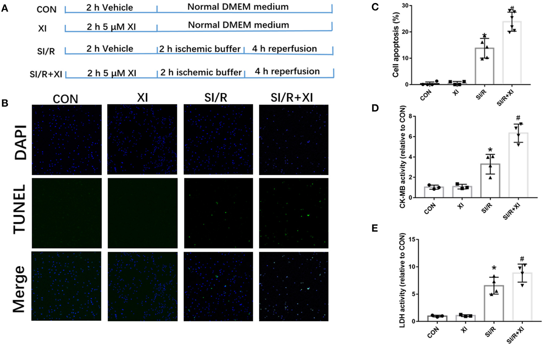 4μ8C, an XBP1 inhibitor, increased H9c2 cell apoptosis LDH and CK-MB activities in vitro. (A) A schematic illustration of the study groups and in vitro experimental protocols. (B) Representative images of cell apoptosis by TUNEL staining in SI/R-induced cell injury following 4μ8C pretreatment. (C) The quantitative analysis of cell apoptosis following 4μ8C pretreatment. Eight random fields were selected for quantitation of cell apoptosis for each repeat experiment. (D) LDH activity. (E) CK-MB activity. n = 3–4 in each group. XI, XBP1 inhibitor; LDH, lactate dehydrogenase; CK-MB, creatine kinase-MB; SI/R, stimulated ischemia/reperfusion. Bar, 50 μm. *P < 0.05 vs. CON group, #P < 0.05 vs. SI/R group.