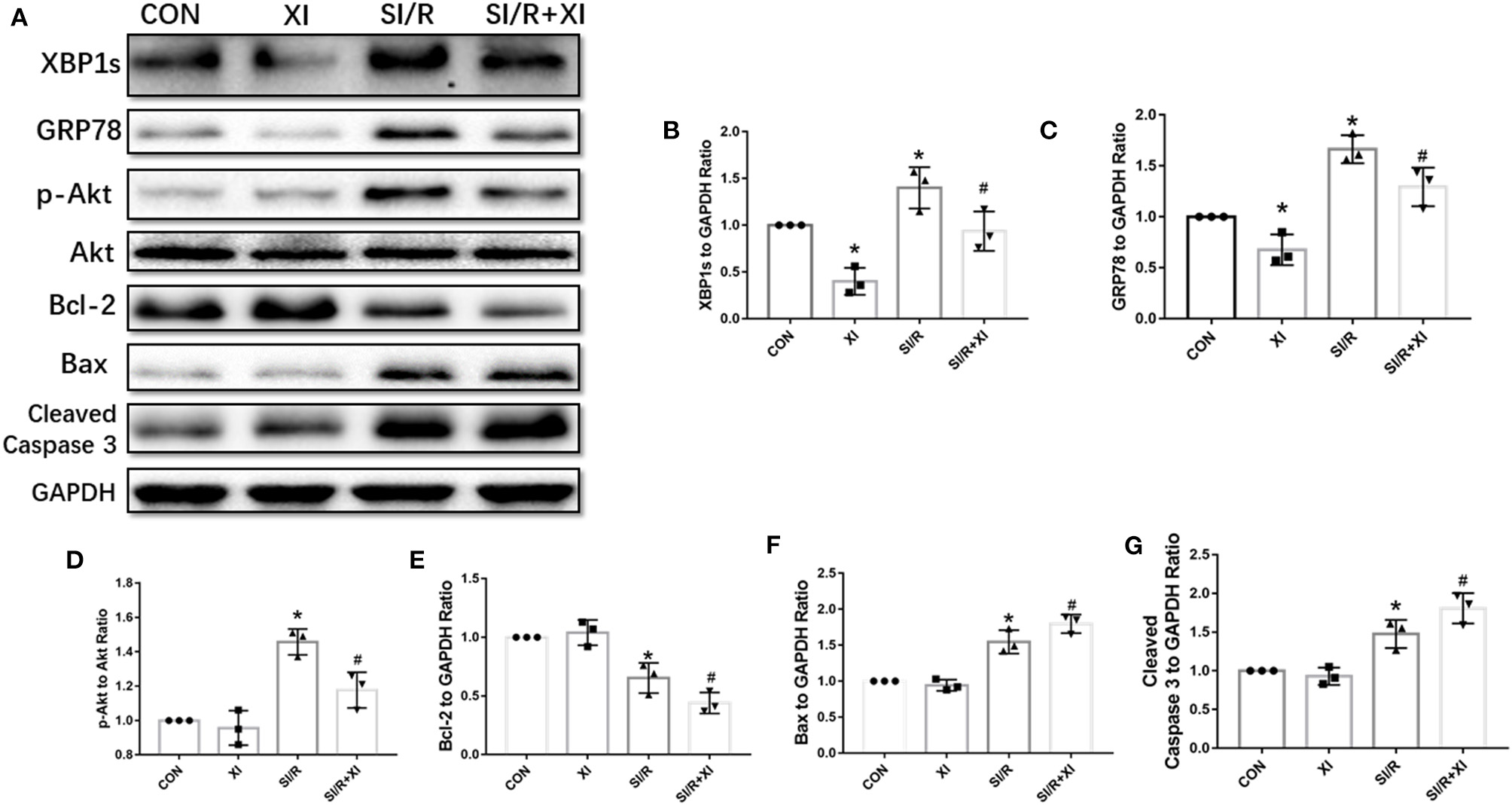 4μ8C inhibited XBP1/GRP78/Akt pathway and enhanced apoptotic protein expressions in vitro. (A) Representative blot images of proteins related to XBP1/GRP78/Akt and apoptotic signaling pathways in H9c2 cells. (B–G) The quantitative analysis of XBP1, GRP78, p-Akt, Bcl-2, Bax, and cleaved Caspase 3 protein expressions. n = 3 in each group. *P < 0.05 vs. CON group, #P < 0.05 vs. SI/R group.