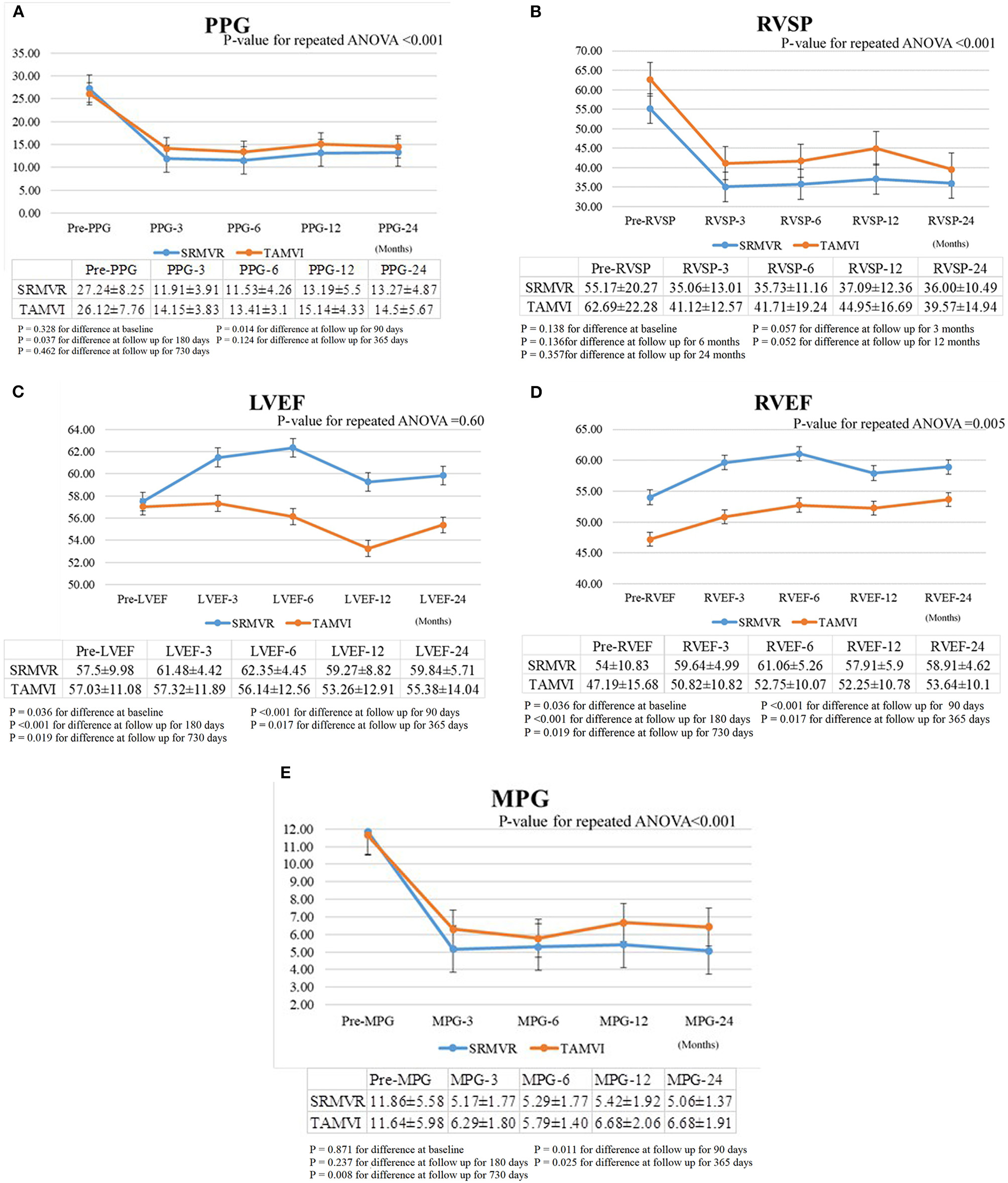 Continuous variables were reported as mean ± SD or median (range) and tested using a two-sample independent t-test or Mann-Whitney U test, respectively. Categorical variables were examined using the chi-square test or fisher's exact test. A repeated measures analysis of variance and McNemar's test were performed to clarify the results of the echocardiographic findings between the SRMVR and TAMVI groups. Survival curves were analyzed using the Kaplan-Meier method and compared using the log-rank test. A two-sided p-value of <0.05 was considered statistically significant. All statistical analysis was performed using IBM SPSS statistics, version 20 (IBM, Armonk, NY).