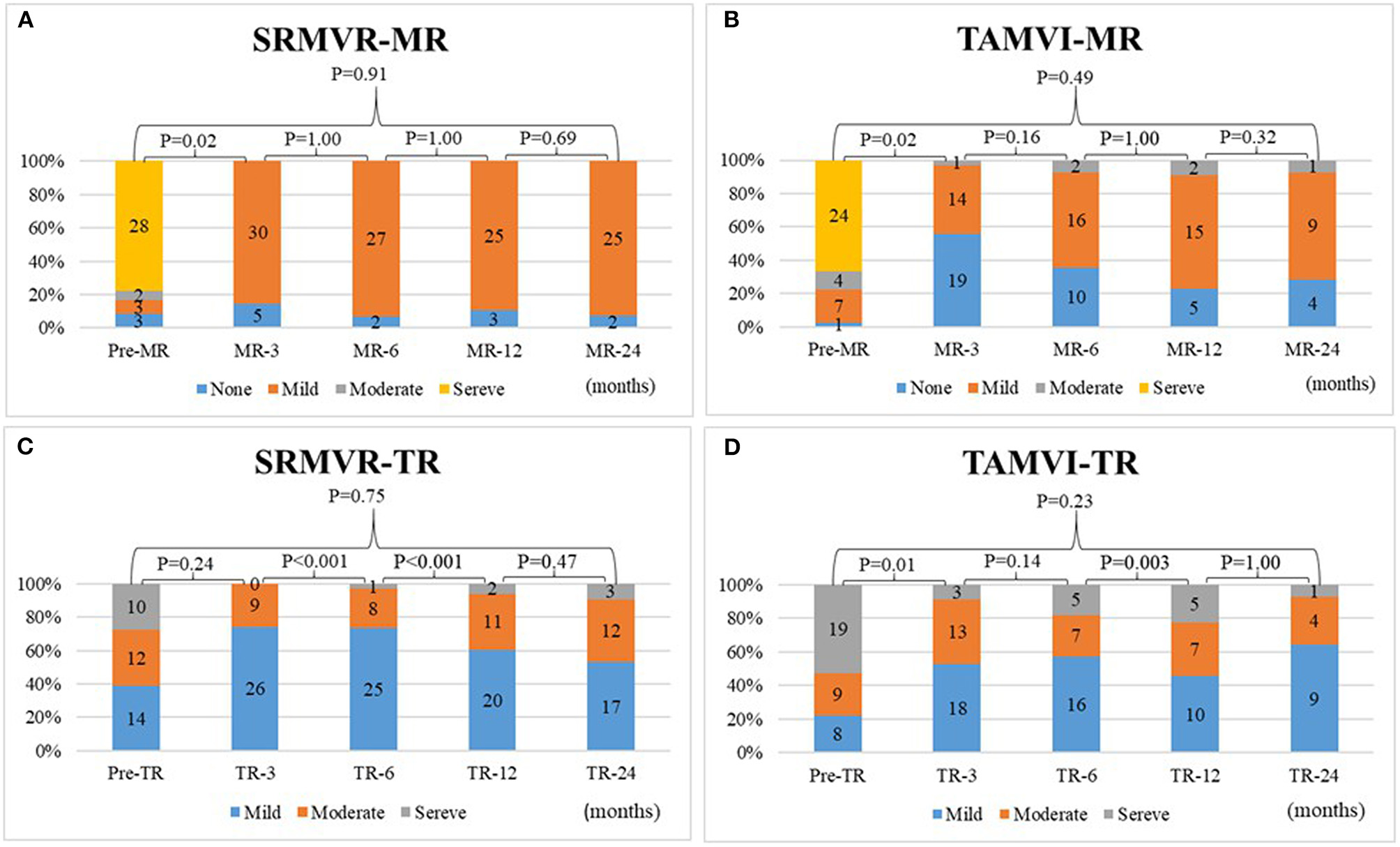 Results: We retrospectively identified patients with symptomatic mitral bioprosthetic valve dysfunction (n = 58) and failed annuloplasty rings (n = 14) who underwent redo SRMVR (n = 36) or TAMVI (n = 36). The Society of Thoracic Surgeons Predicted Risk of Mortality scores were higher in the TAMVI group (median: 9.52) than in the SRMVR group (median: 5.59) (p-value = 0.02). TAMVI patients were more severe in New York Heart Association (p-value = 0.04). The total procedure time (skin to skin) and length of stay after procedures were significantly shorter in the TAMVI group, and no significant difference in mortality was noted after adjustment for confounding factors (p-value = 0.11). The overall mean mitral valve pressure gradient was lower in the TAMVI group than in the SRMVR group at 24 months (p < 0.01). Both groups presented a decrease in the severity of mitral and tricuspid regurgitation at 3–24 months.