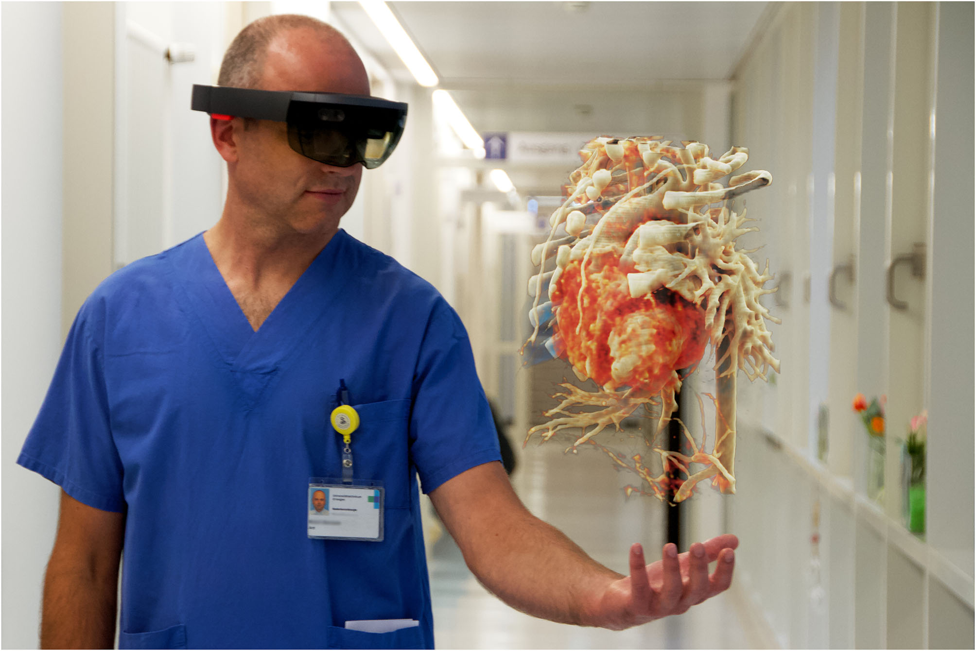 Surgeon looking at a CR-hologram of a patient's heart with dextro-transposition of the great arteries using HoloLens®. The figure illustrates an image for which the view of the surgeon through the HoloLens® was combined with a photo in which he is working with the HoloLens®.