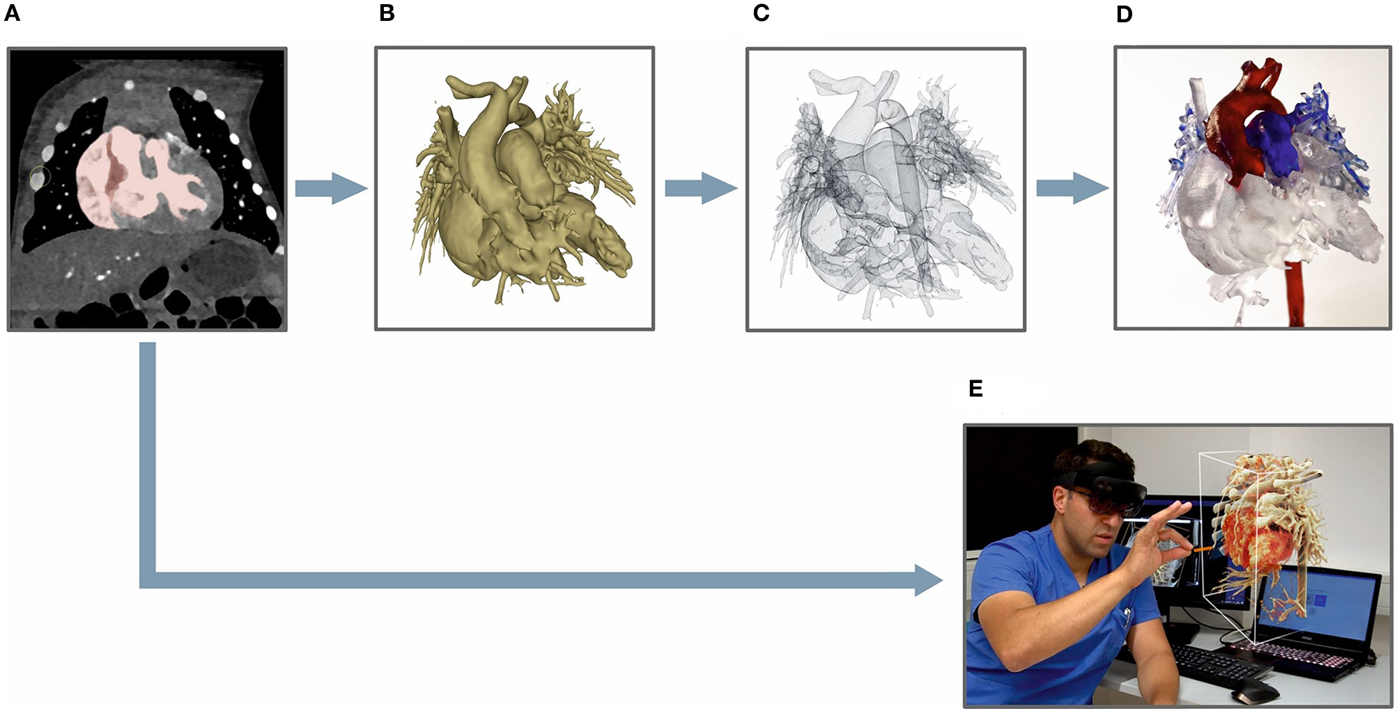 There are clear limits to the representation of intracardial and intravascular structures since the current version of the HoloLens® only allows viewing of the outer surface without interactive cutting through the patient's heart. In the next version of the HoloLens®, an interactive cutting through the hologram will be possible. A further potential expansion of the presentation of CR-holograms would be a multi-user system that would enable joint discussion in 3D space. Furthermore, the visualization of hemodynamic information will likely be possible in future versions. The presentation of functional examinations (e.g., heart beating, 4D phase contrast, 4D speckle tracking) in 3D space is conceivable and would facilitate locating anatomical structures.