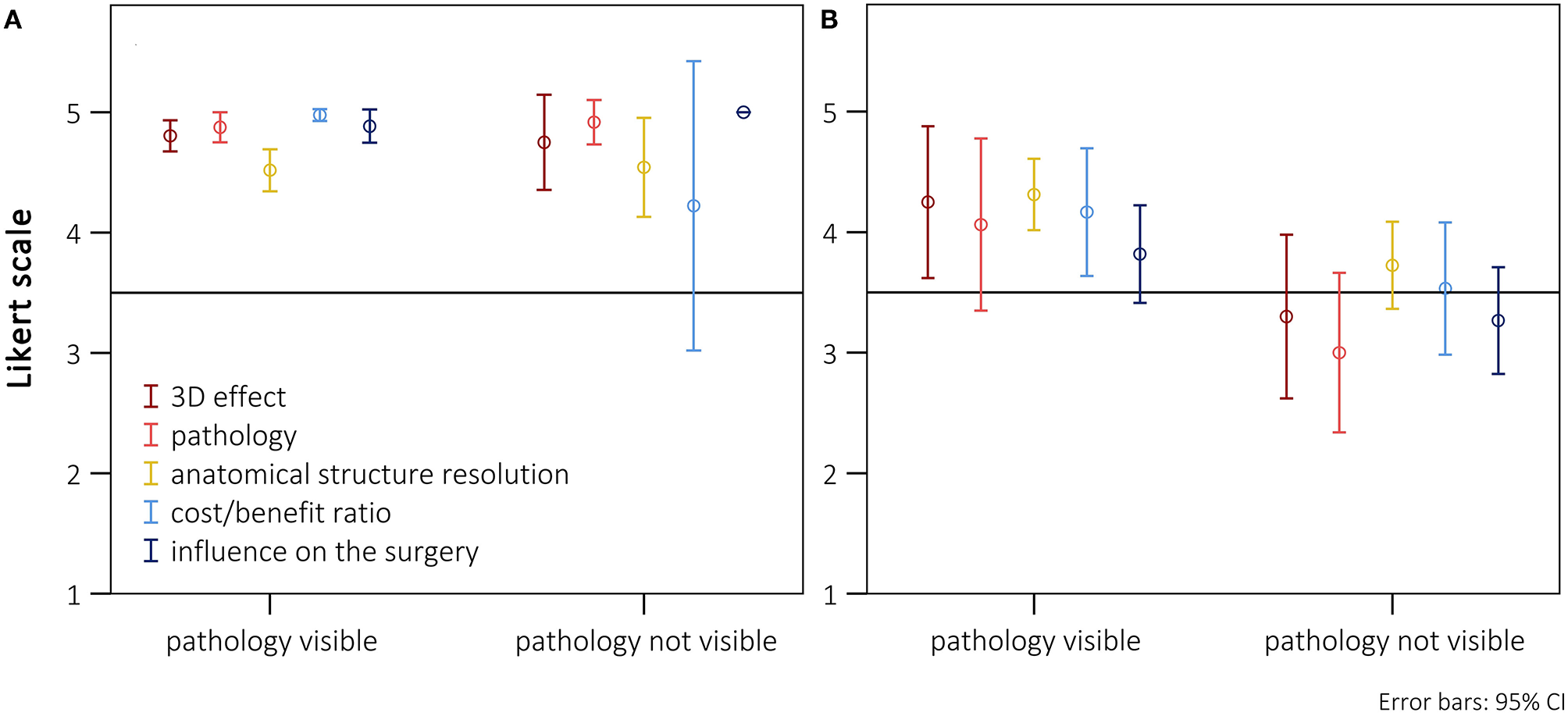 In total, the questionnaire comprised 22 items, each rated on a 5-point Likert scale. The five response options ranged from “clearly superior” (5 points) to “clearly inferior” (1 point). The questionnaire items were structured in five subgroups to provide a better overview: 3D-imaging effect, representation of the pathology, anatomical structure resolution, cost/benefit ratio, and influence on the surgery (Table 2). The reliability of the different items of each dimension was checked using Cronbach's alpha.