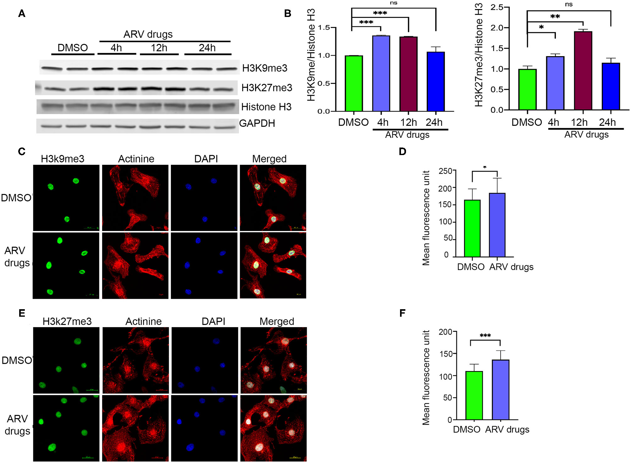 ARV drugs treatment promotes repressive histone marks. (A,B) Western blot shows antiretroviral drug treatment increase the methylation of H3K27me3 and H3K9me3. NRVCs were treated with ARV drugs (5 μM of Ritonavir, Abacavir, Atazanavir and Lamivudine) for 4, 12, and 24 h and western blots were done with total protein lysate. Graph shows quantification of western blots (***p < 0.001; **p < 0.01, ns, not significant) (C) Representative images show immunofluorescence staining of NRVCs stained with H3K9me3 (green), actinin (red), and nucleus stained with DAPI (blue). Cells were treated with ARV drugs for 12 h and fixed with 4% PFA. (D) Graph shows quantification of microscopic images (n = 50 cells); (*p < 0.05). (E) Representative images show immunofluorescence staining of NRVCs stained with H3K27me3 (green), actinin (red), and nucleus stained with DAPI (blue). Cells were treated with ARV drugs for 12 h and fixed with 4% PFA. (F) Graph shows quantification of microscopic images (n = 50 cells); (***p < 0.001).
