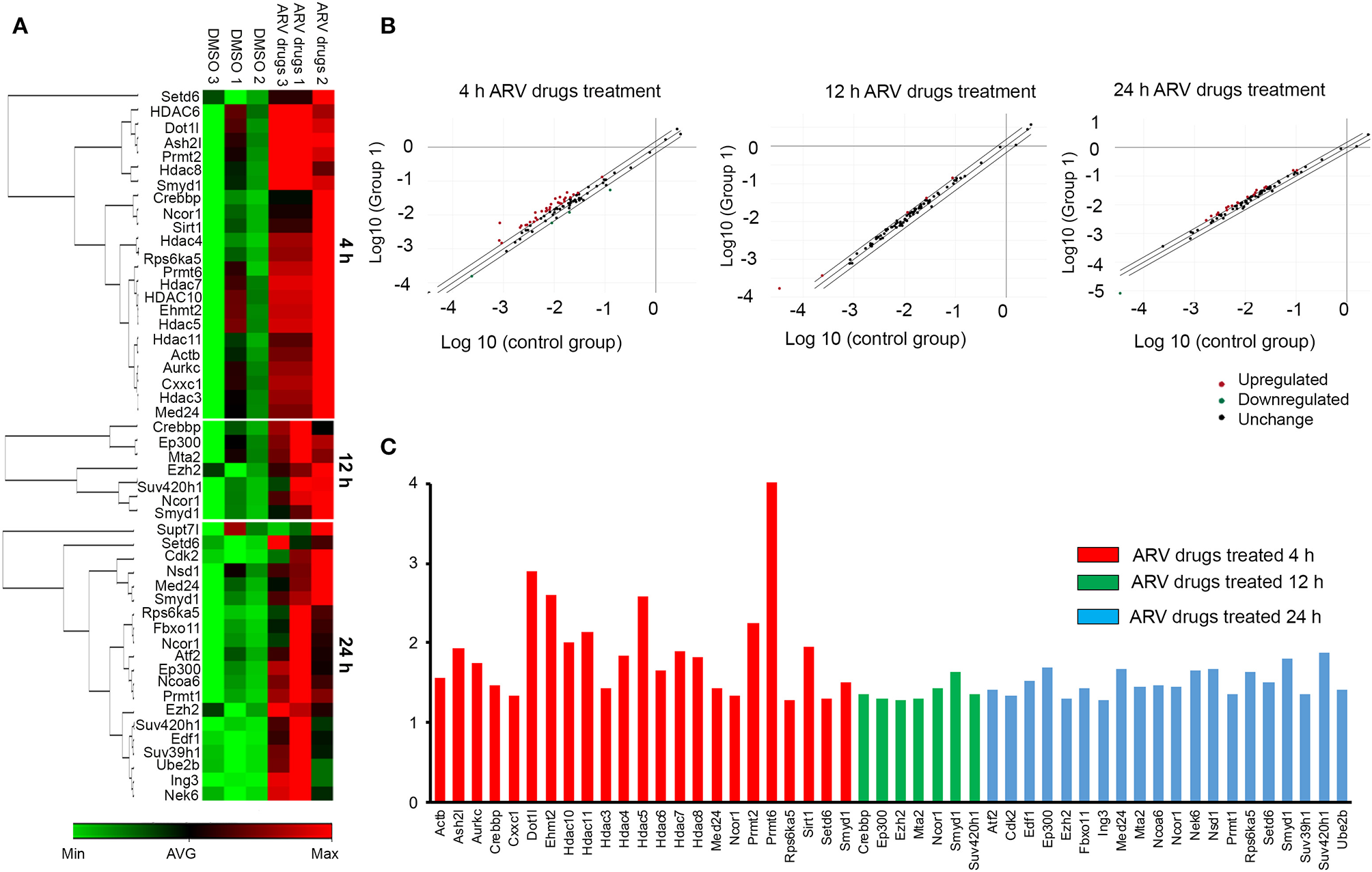 Total RNA was isolated from NRVCs treated with ARV drugs using the RNeasy miniprep kit (Qiagen, Germantown, MD) following the manufacturer instructions and quantified by Nanodrop 8000 (Thermo Scientific, Waltham, MA). Epigenetic modifying enzyme expression was assessed using the rat chromatin RT2 Profiler PCR array (PARN-085Z, Qiagen). First-strand cDNA was generated from 500 ng total RNA using the RT2 first-strand synthesis kit (Qiagen). Quantitative real-time PCR (qRT-PCR) reactions were prepared with RT2 SYBR Green/ROX PCR master mix and run on the Step One-Plus PCR machine (Applied Biosciences, Foster City, CA) with the standard SYBR green PCR program. PCR data was analyzed using the web-based tool provided by manufacturer (https://dataanalysis2.qiagen.com/pcr). Differentially expressed chromatin modifying enzymes in ARV drugs-treated NRVCs were identified with a fold change >1.2. Statistical significance was determined by Student's t-test of the replicate 2−ΔΔCT values for each gene in the control vs. treatment groups. A p < 0.05 was considered significant. PCR array results were normalized using the housekeeping genes Actb, Ldha, Bm2, and Hrpt1. Expression of differentially expressed epigenetic chromatin modification enzymes was validated by qRT-PCR and western blot.