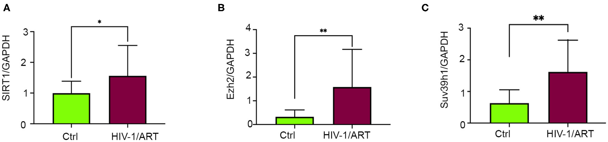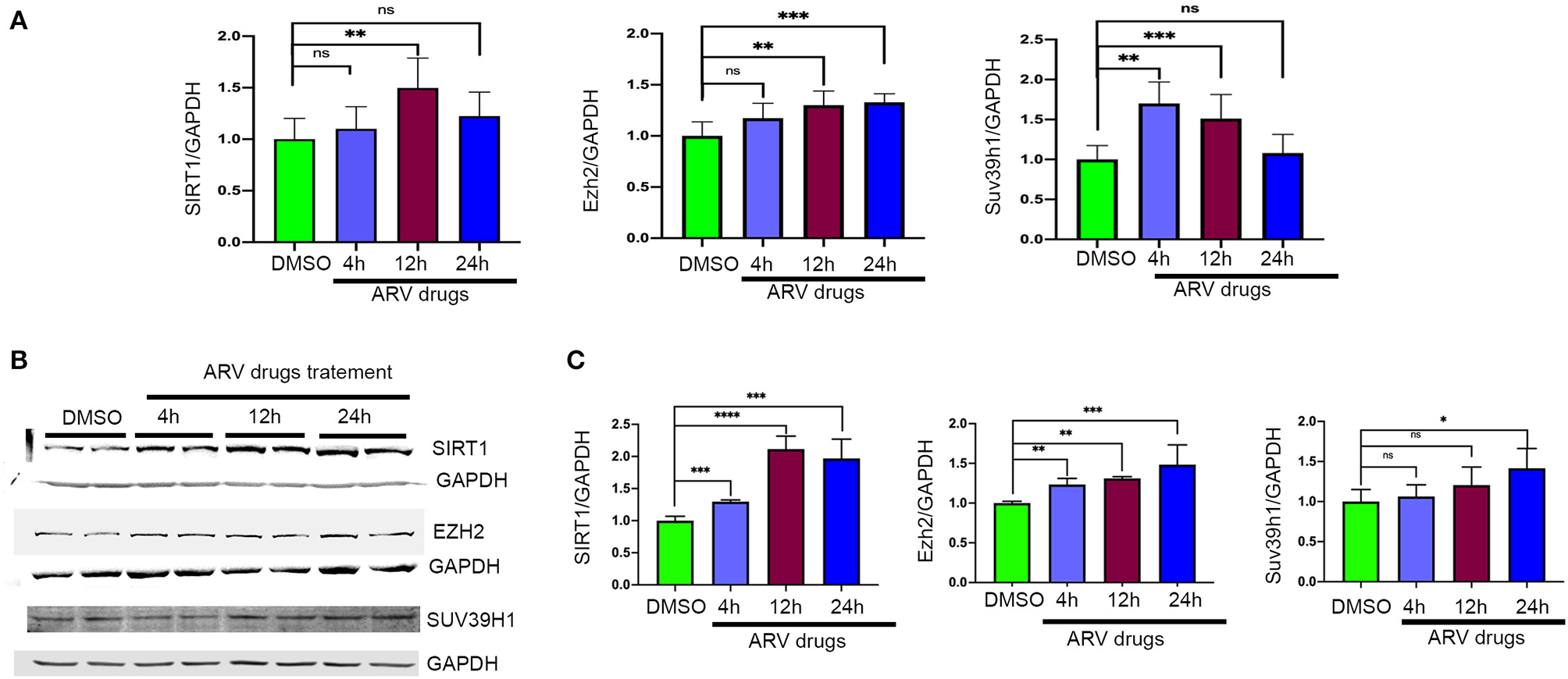 To understand the correlation of ARV drugs and epigenetic changes, we measured the expression of chromatin remodeling enzymes in NRVCs after ARV drugs treatment. NRVCs were treated with ARV drugs for 4, 12, and 24 h, and the expression of chromatin remodeling enzymes was assessed by RT2 PCR array profiling. Analysis of the PCR array data showed that out of 84 genes, 50 epigenetic modifying chromatin enzymes were differentially regulated in NRVCs after drug treatment (Table 2). PCR array data analysis represented in clustergrams, scattered plots, and bar graphs (Figures 3A–C) showed that drug treatment differentially regulated the expression of chromatin modifying enzymes in cardiomyocytes. In our western blot data at Figures 1, 2, we found that ARV drugs modify the acetylation as well as methylation of histone 3. Interestingly, in PCR array result we found that the histone deacetylase enzyme SIRT1 (Fold Change (FC) = 1.95; p = 0.02) and the methyl transferase enzyme SUV39H1 (FC = 1.36; p = 0.01) and Ezh2 (FC = 1.3; p = 0.02) were significantly modulated in ARV drug-treated cells compared to control cells (Figures 3A–C). PCR array results for SIRT1, EZH2, and SUV39H1 were validated with qRT-PCR in NRVCs treated with ARV drugs for 4, 12, and 24 h. Expression analysis confirmed that ARV drugs treatment upregulated the expression of SIRT1, SUV39H1, and EZH2 at 12 h post treatment (Figure 4A). We also examined the expression of SIRT1, EZH2, and SUV39H1 at the protein level in NRVCs treated with ARV drugs for 4, 12, and 24 h. Western blot analysis showed that the expression of these epigenetic regulating enzymes was significantly upregulated in drug treated cells (Figures 4B,C). Additionally, we validated our in vitro expression data in clinical samples obtained from HIV-1-infected patients treated with ART (Table 3). Total RNA was isolated from heart tissue and the expression of SIRT1, EZH2, and SUV39H1 was measured by qRT-PCR using gene specific primers (Table 1). We used healthy donor human heart tissue for comparison (Table 3). Expression analysis shows that similar to our in vitro results, the expression of SIRT1, EZH2, and SUV39H1 was significantly upregulated in HIV+ patients compared to healthy donor samples (Figures 5A–C).