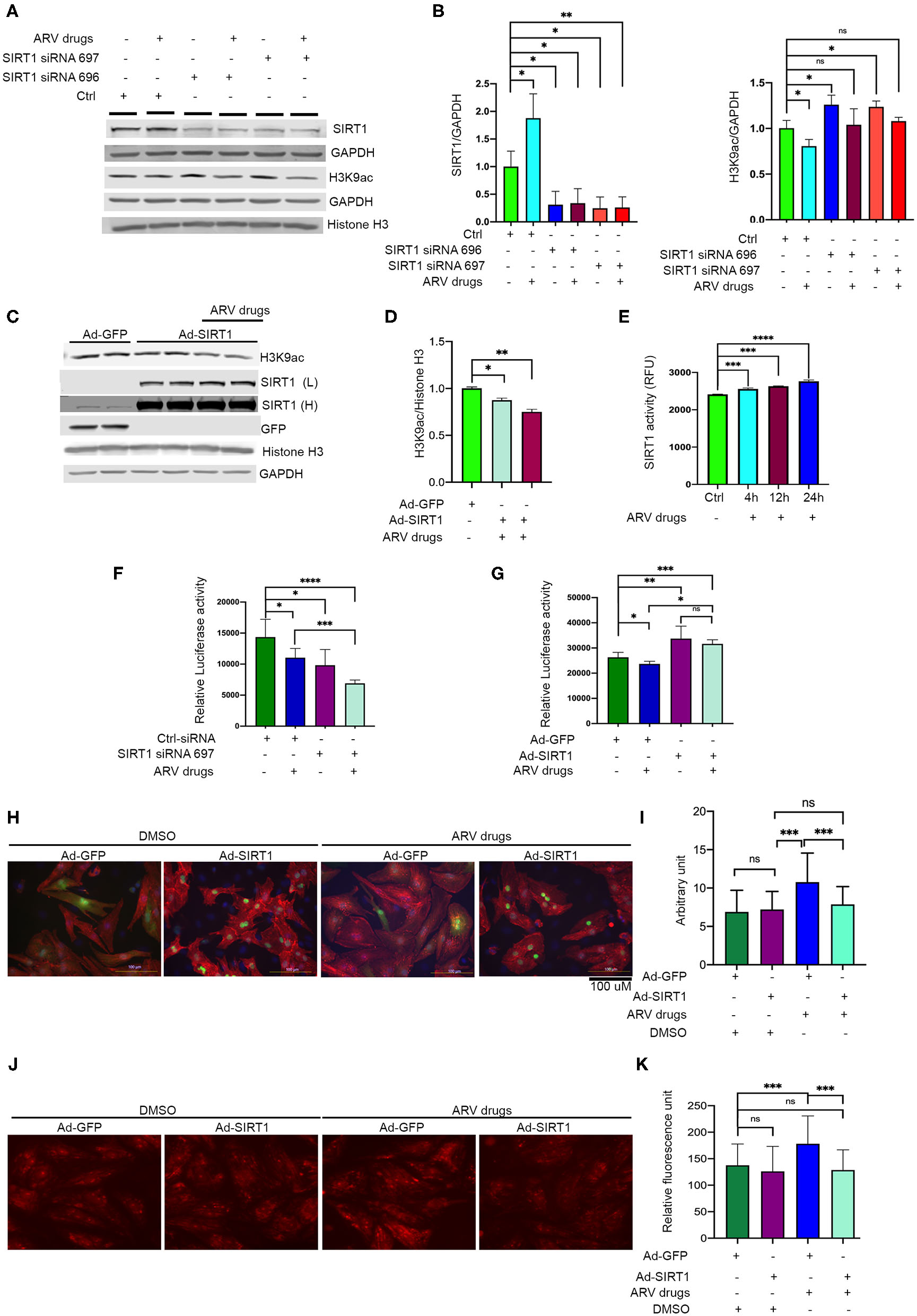 For knockdown of SIRT1, 1 × 106 rat primary cardiomyocytes were plated in 60 mm plates. siRNAs were transfected using Lipofectamine 2000 in optimum media (Gibco) for 3 h, then the media was replaced with DMEM having 2% FBS for 48 h. Sirt1 was knocked down in rat cardiomyocytes using siRNA (SASI-Rn 02; 00230695, 00230696, 00230697, Sigma), and control cells were transfected with universal negative siRNA (Sigma). When needed, cells were incubated with ARV drugs (5 μm of ritonavir, abacavir, atazanavir, and lamivudine) in DMEM having 2% FBS for different time points and cells were harvested for protein as described above. Similarly, knockdown of Ezh2 was performed using siRNA (s155284, Thermofisher).