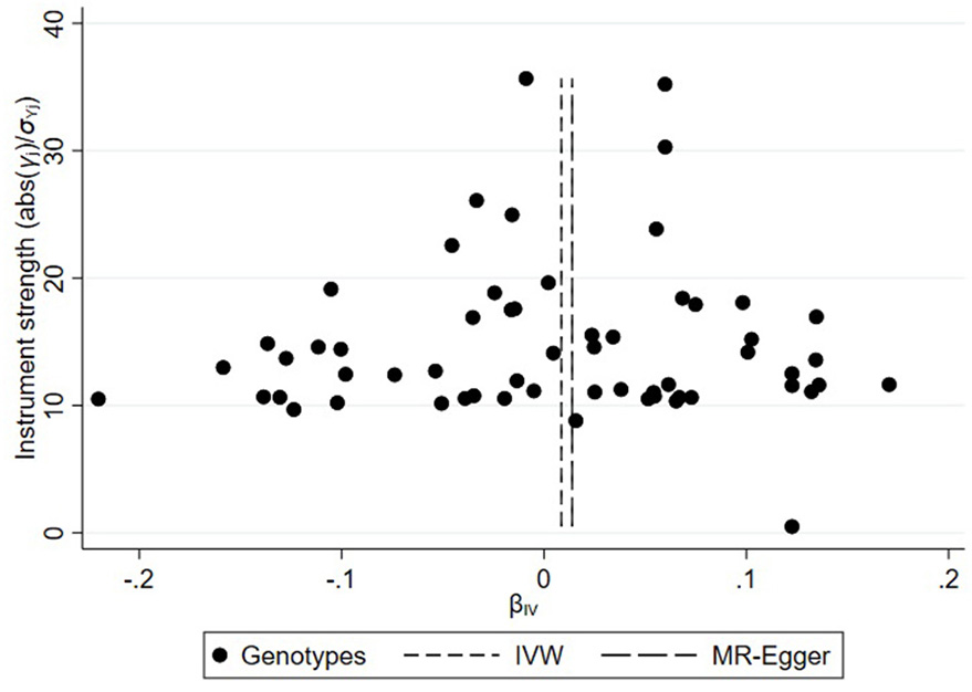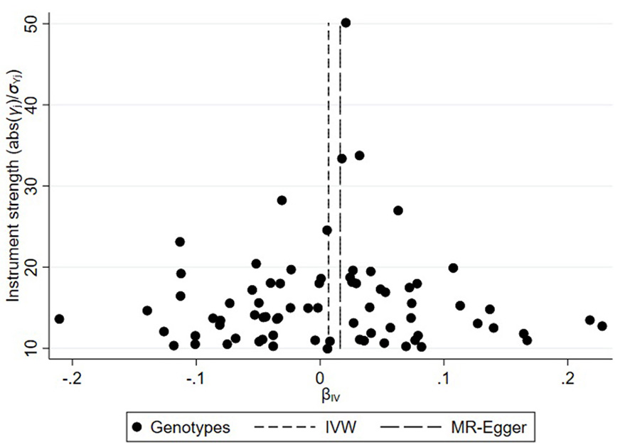 On the basis of the abovementioned protocol, there were 75, 60, and 95 SNPs extracted as instrumental variables, which explained 10.0, 10.0, and 9.0% of the variance in the liability of CD, UC, and IBD, respectively. The I2 index of 30% and the funnel plots did not support substantial heterogeneity across the estimates, suggesting an absence of potential pleiotropic effects among SNPs of CD or UC (Figures 1, 2). A similar presence of low heterogeneity in IBD was displayed in Supplementary Figure 1. The detailed characteristics and associations with the remaining SNPs were presented in Supplementary Tables 1–3. The MR analysis had 75% power at an alpha rate of 5% to detect an OR of 1.08 per log odds of CD, UC, and an OR of 1.07 per log odds of IBD.