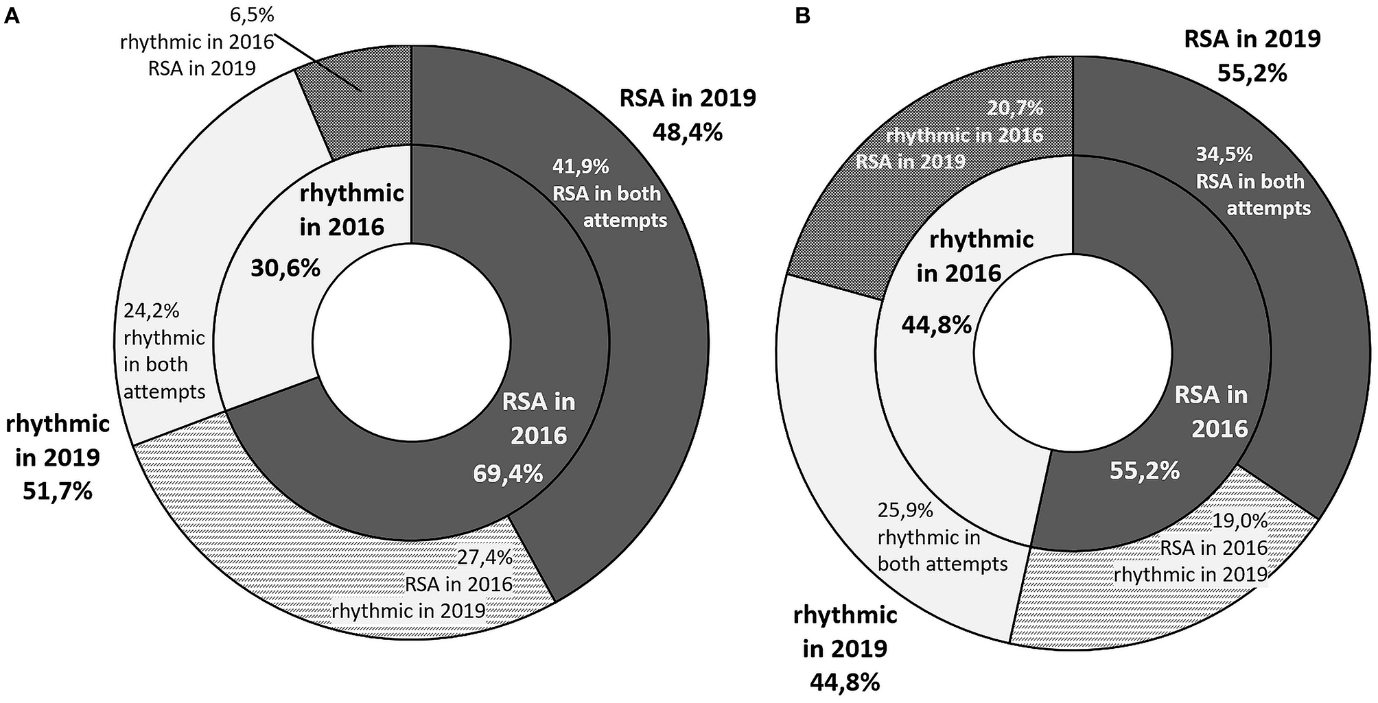 A graphic representation of the proportion of students with respiratory sinus arrhythmia in both visits. The inner ring represents the health status in year 2016, and the outer ring - in 2019. The participants whose status changed across time are represented with intermediate colors in the outer ring (A) graph stands for boys and (B) one for girls.