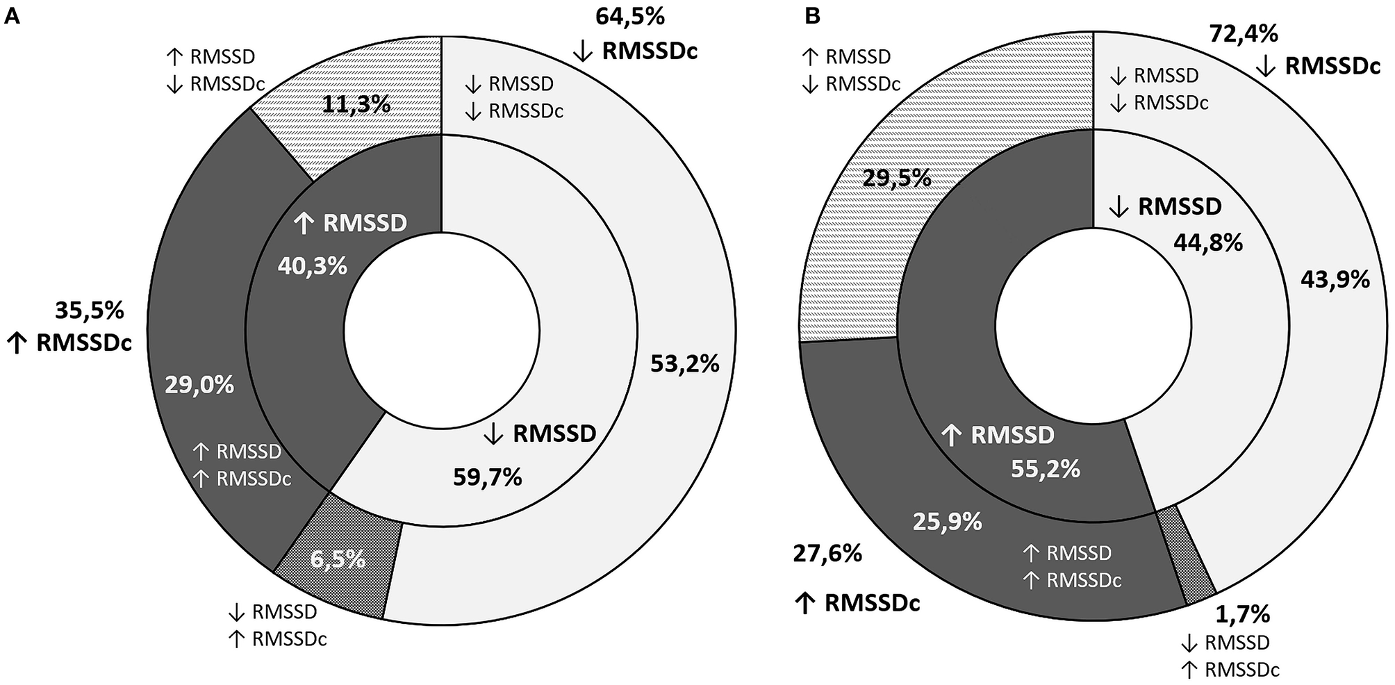 A graphic representation of the proportion of students with an increase or decrease in RMSSD (inner ring) and RMSSDc (outer ring) throughout the observation period (A) graph stands for boys and (B) one for girls.