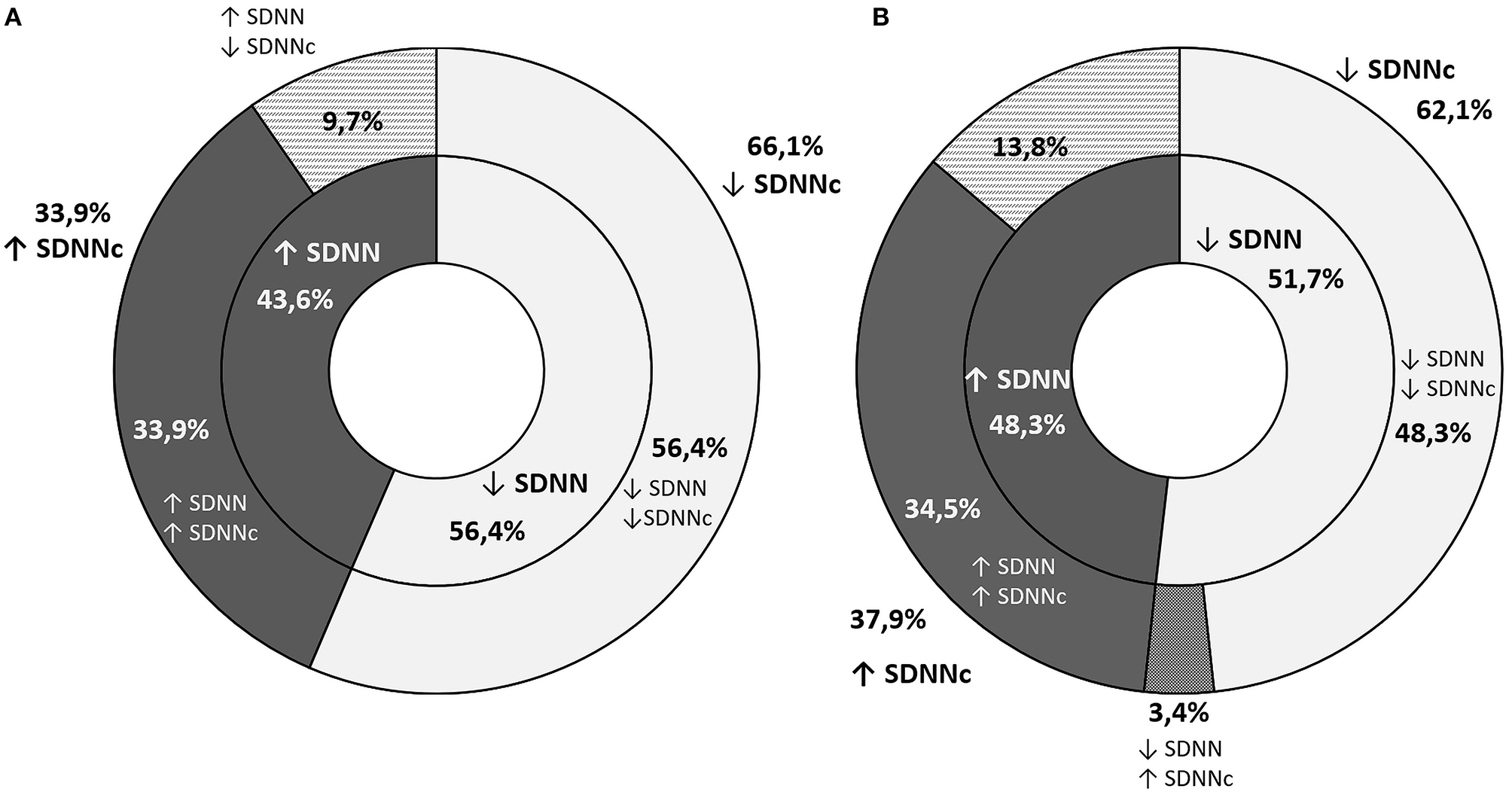 A graphic representation of the proportion of students with an increase or decrease in SDNN (inner ring) and SDNNc (outer ring) throughout the observation period (A) graph stands for boys and (B) one for girls.