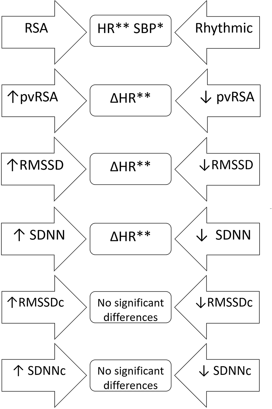 A scheme of comparative analysis of independent samples regarding anthropometric and laboratory variables as well as their changes across time in relation to the trajectory of various RSA indices. The arrow-shaped fields represent compared subgroups; variables, for whom the differences were statistically significant were listed in the middle part. RSA, students with respiratory sinus arrhythmia at both visits; Rhythmic, students with rhythmic heart rate on both electrocardiograms; ↑, increase in a distinct variable across time; ↓, decrease in a distinct variable across time; Δ, change of the parameter throughout the observation period. *p < 0.05; **p < 0.001.