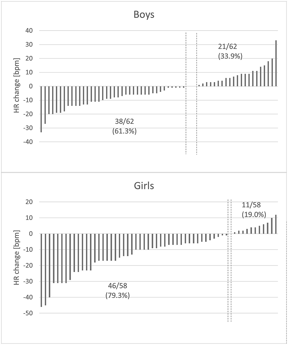 Changes in heart rate in relation to sex. The y-axis represents heart rate difference (the 2019 HR value – the 2016 HR value), with each column representing one child. The x-axis represents study participants arranged by HR difference. The vertical dashed lines symbolize class limits between participants whose HR increased and decreased over the course of our study. HR decreased in 79.3% of girls and only in 61.3% of boys. There was a substantial difference between the degree of HR change observed in boys and in girls (p = 0.002).