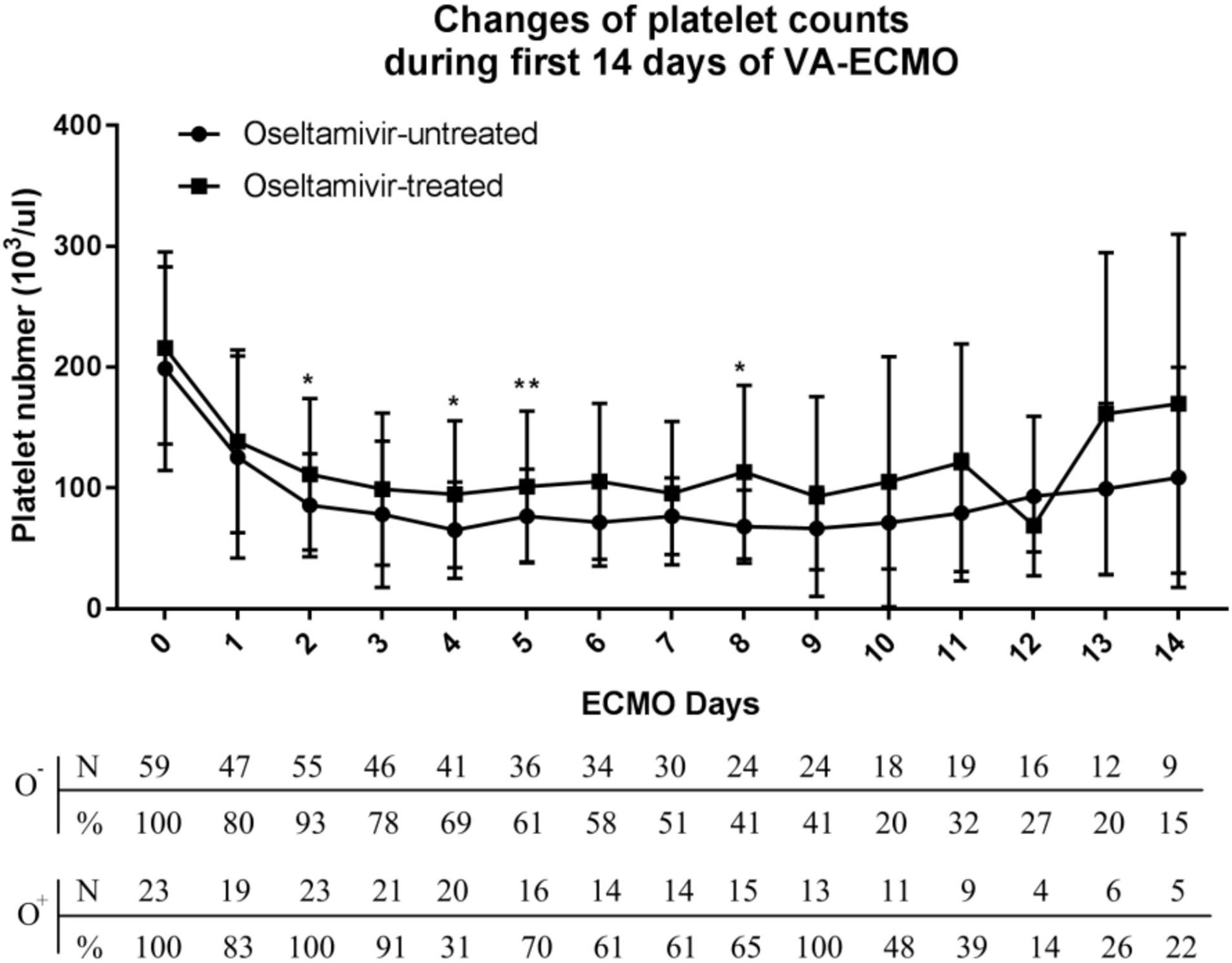 Variation of platelet counts in the oseltamivir-treated and oseltamivir–untreated groups during the first 14 days of veno-arterial extracorporeal membrane oxygenation (VA-ECMO) support.