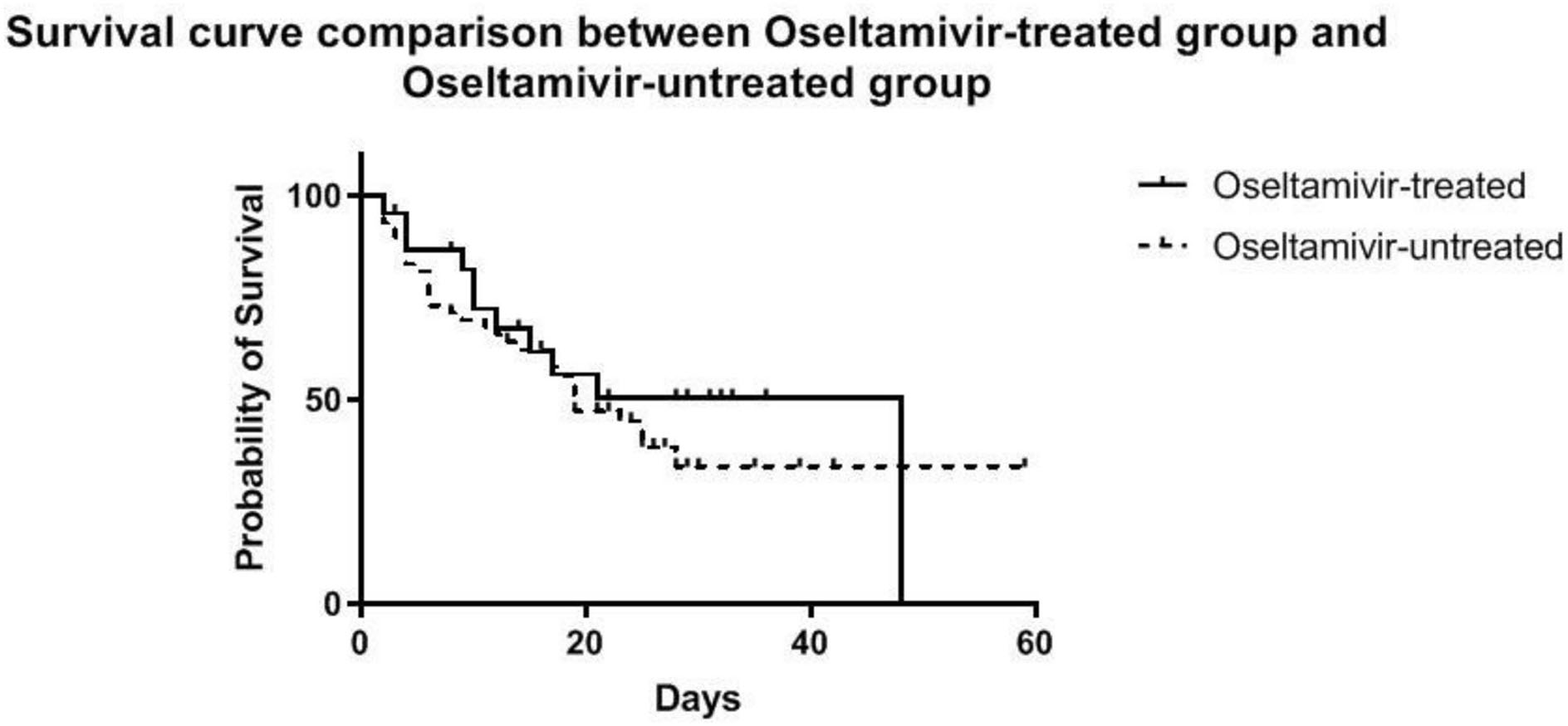 Estimated survival of patients during VA-ECMO support until the time of discharge, stratified into the oseltamivir -treated and -untreated group.