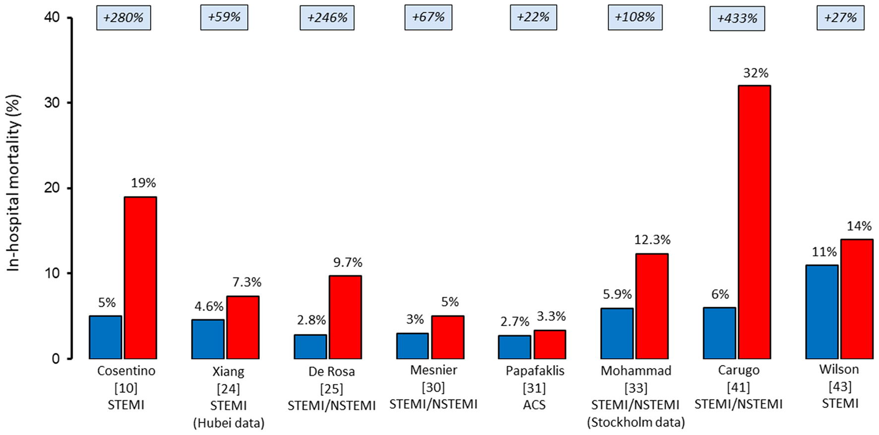 In-hospital mortality rates of patients hospitalized with acute myocardial infarction before (blue) and during (red) the COVID-19 pandemic. ACS, acute coronary syndrome; NSTEMI, non-ST-elevation myocardial infarction; STEMI, ST-elevation myocardial infarction.