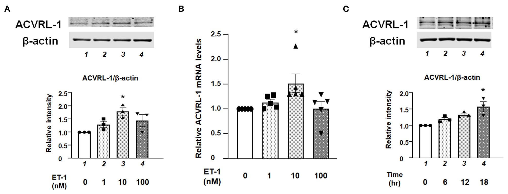 Western blotting and qPCR demonstrated that protein and mRNA expressions of ACVRL-1 were increased by ET-1 stimulation in the PAECs (Figures 1A,B). Further, these results indicate that the upregulation of ACVRL-1 was not necessarily dependent on the dose of ET-1. Figure 1C shows the time course of ACVRL-1 expressions in response to ET-1 stimulation.