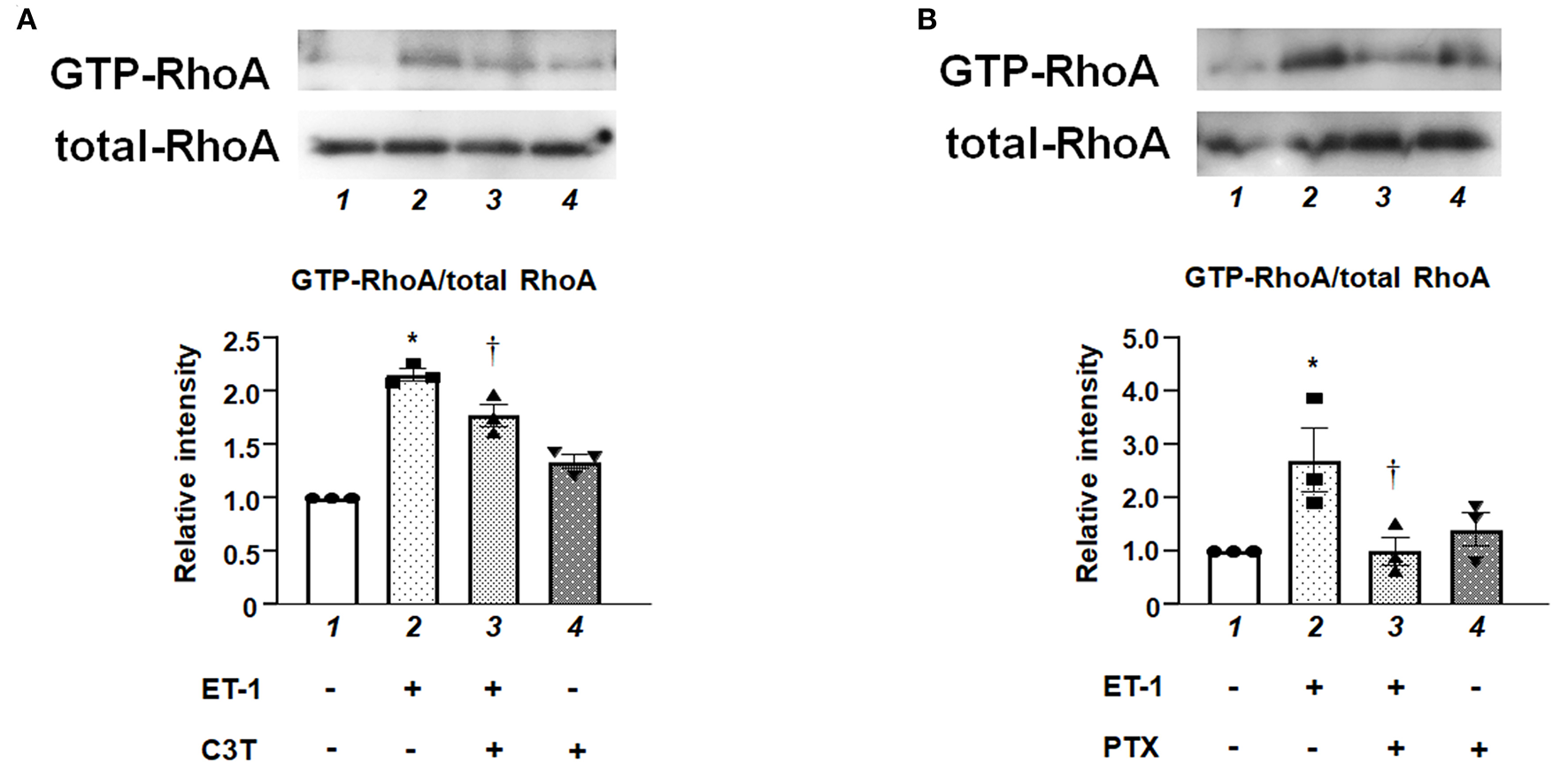 (A) Levels of GTP-bound active form of RhoA in cultured human PAECs. PAECs were pre-treated with C3T (0.25 μg/mL) overnight before adding ET-1. After 5 min of ET-1 stimulation (10 nmol/L), GTP-loading of RhoA was determined by pull-down assays. Lane 1, PAECs alone (control); lane 2, PAECs + ET-1; lane 3, PAECs + ET-1 + C3T; and lane 4, PAECs + C3T. (B) PAECs were pretreated with 100 ng/mL of PTX overnight before adding ET-1. After 5 min of ET-1 stimulation (10 nmol/L), RhoA activation was determined by pull-down assay. Lane 1, PAECs alone (control); lane 2, PAECs + ET-1; lane 3, PAECs + ET-1 + PTX; and lane 4, PAECs + PTX. Quantitative results of GTP-RhoA were normalized by total RhoA levels. Bars are mean ± SE of quantitative densitometric analyses from three separate experiments. Representative immunoblots are shown at the top. *P < 0.05 vs. lane 1, †P < 0.05 vs. lane 2.