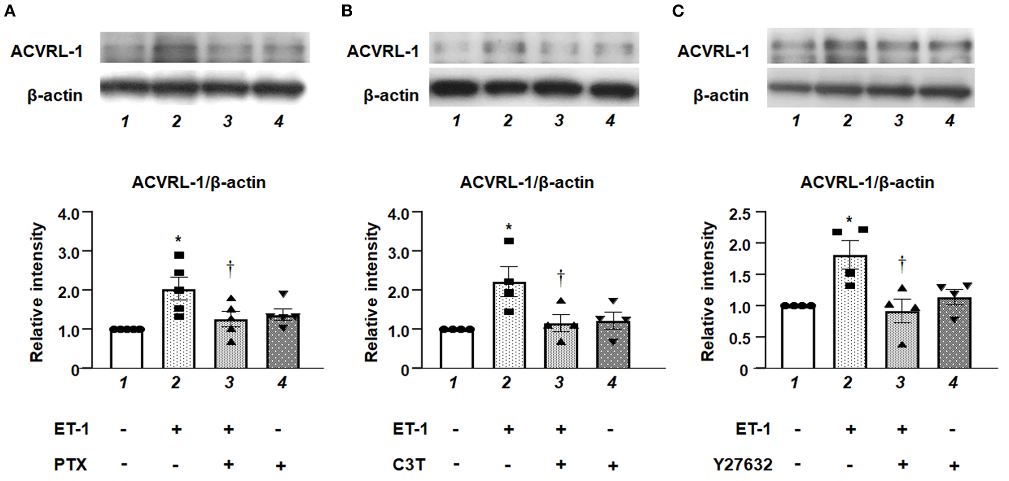 Results: ACVRL-1 expression was increased by ET-1 in the PAECs. Pull-down assay revealed that ET-1 induced GTP-loading of RhoA, which was suppressed by pre-treatment with PTX or C3T. Further, PTX, C3T, and Y27632 suppressed the ET-1-induced ACVRL-1 expression. ET-1 increased the activity of the ACVRL-1 promoter and stabilized the ACVRL-1 mRNA. Sp-1 peaked 15 min after adding ET-1 to the PAECs. PTX and C3T prevented the increase of Sp-1 induced by ET-1. Inhibition of Sp-1 by mithramycin A suppressed ET-1-induced ACVRL-1 upregulation.