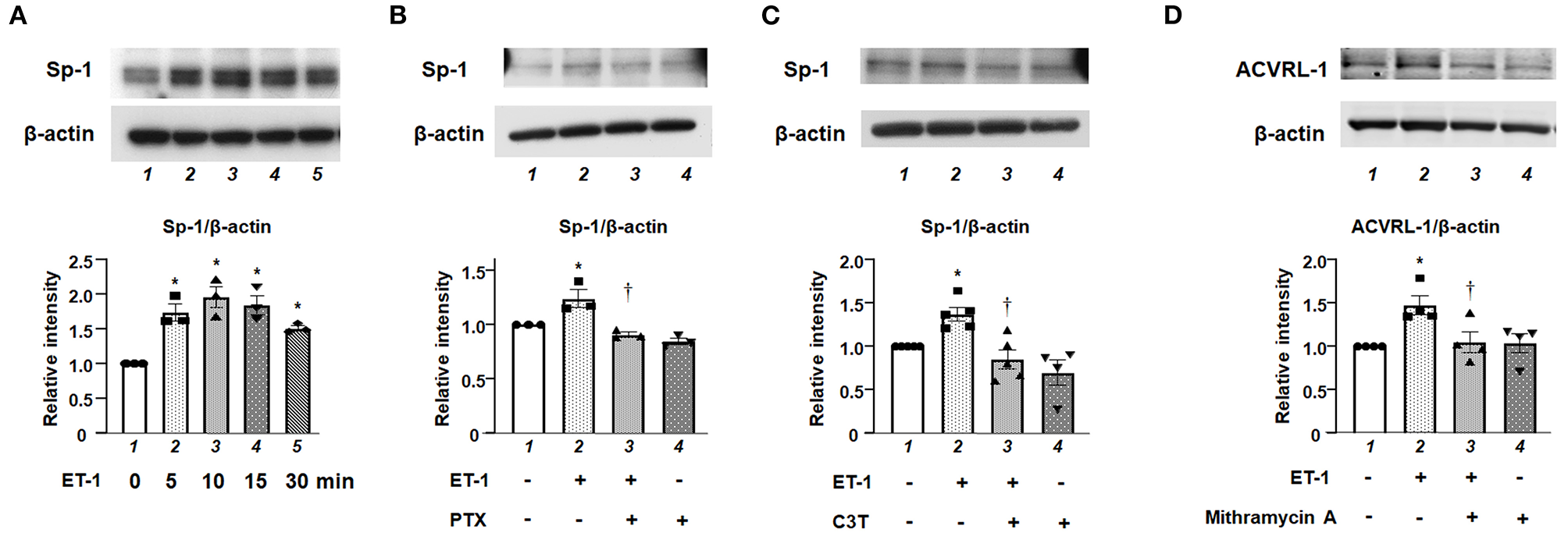 We investigated the role of Sp-1, which is one of the transcriptional factors for ACVRL-1, in ET-1-stimulated PAECs. Figure 5A shows that, after adding ET-1, the level of Sp-1 was increased within 10 min, and peaked after 15 min. Both Gi inhibition by PTX and RhoA inhibition by C3T prevented the increase of Sp-1 level in response to ET-1 (Figures 5B,C). These data indicate that rapid RhoA activation via Gi affects Sp-1 regulation. Furthermore, inhibition of Sp-1 by mithramycin A suppressed ET-1-induced ACVRL-1 upregulation (Figure 5D).