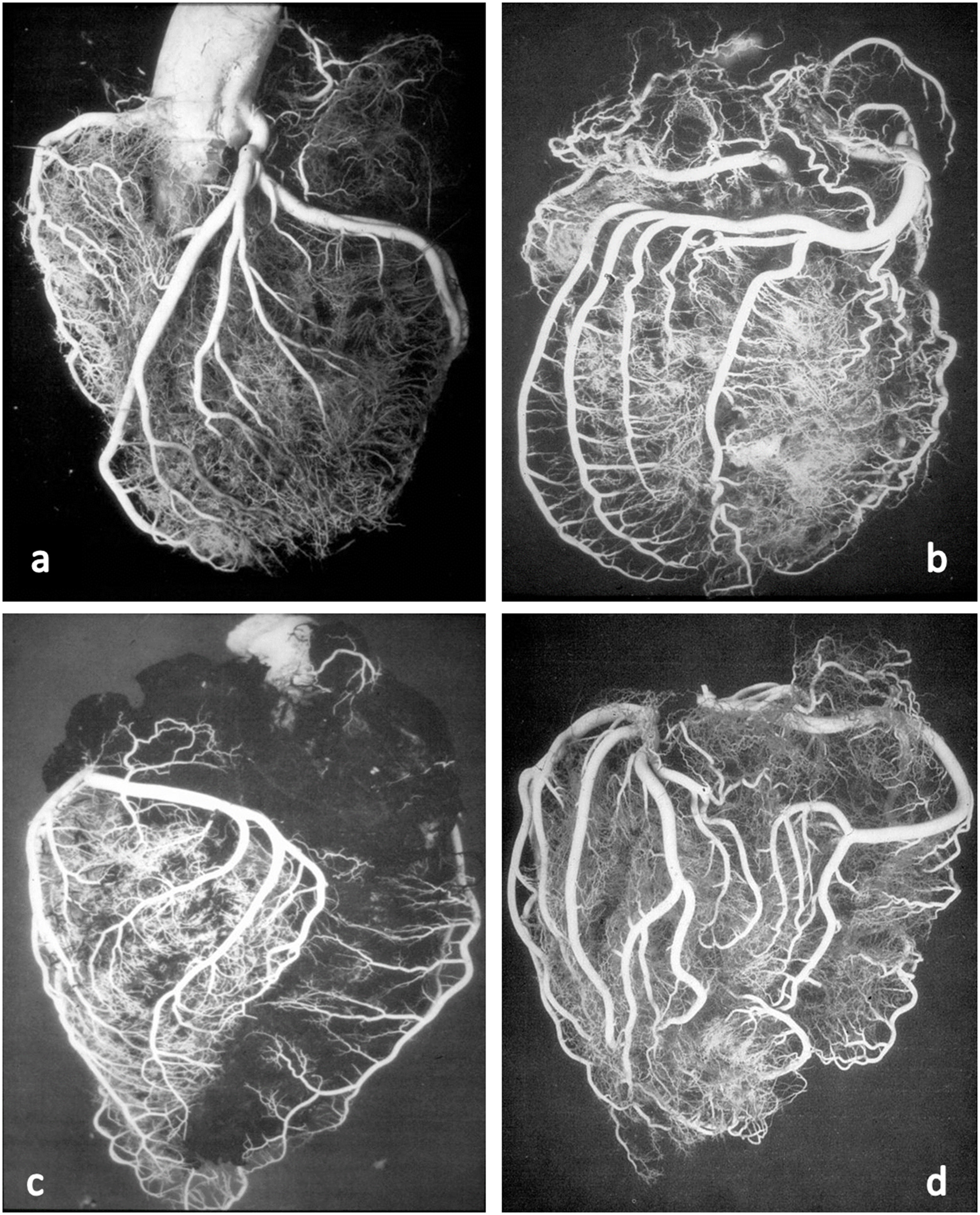 Figure 2. Postmortem casts of coronary arteries. From Baroldi and Scomazzoni (3). (a) Left coronary artery anatomy, (b) dominant right pattern, (c) dominant left pattern, and (d) balanced pattern.