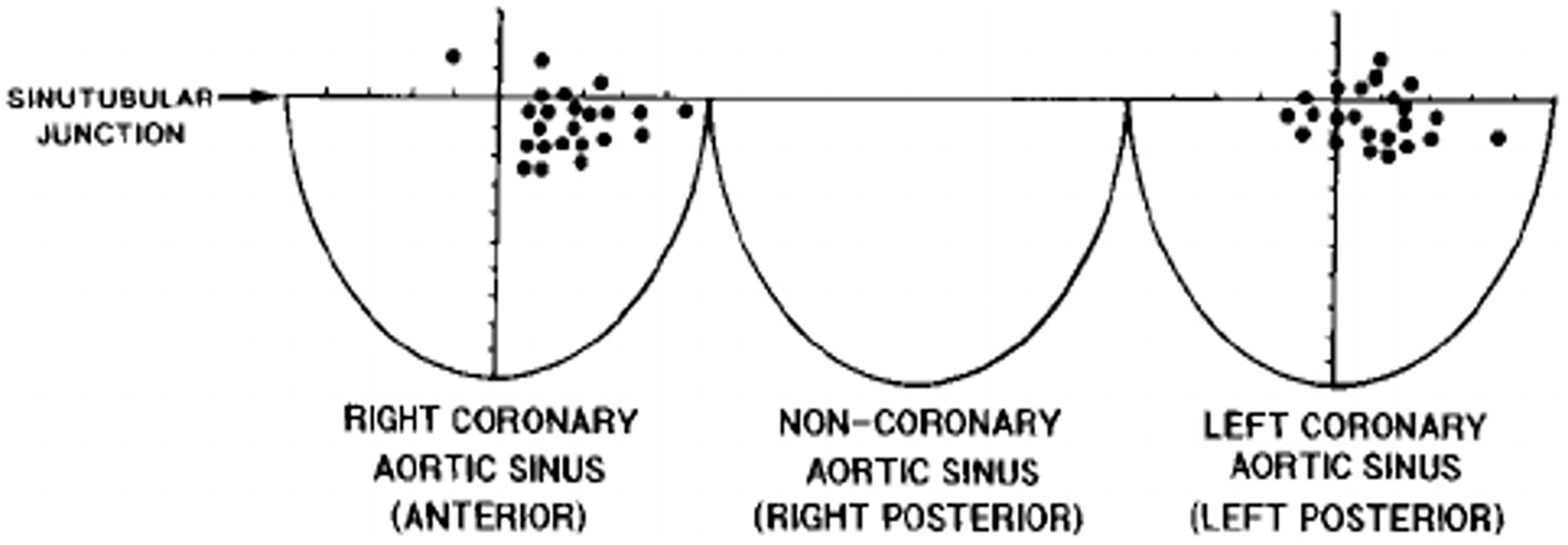 Figure 3. The topographical variability of coronary artery orifices in normal hearts. From Muriago et al. (5).