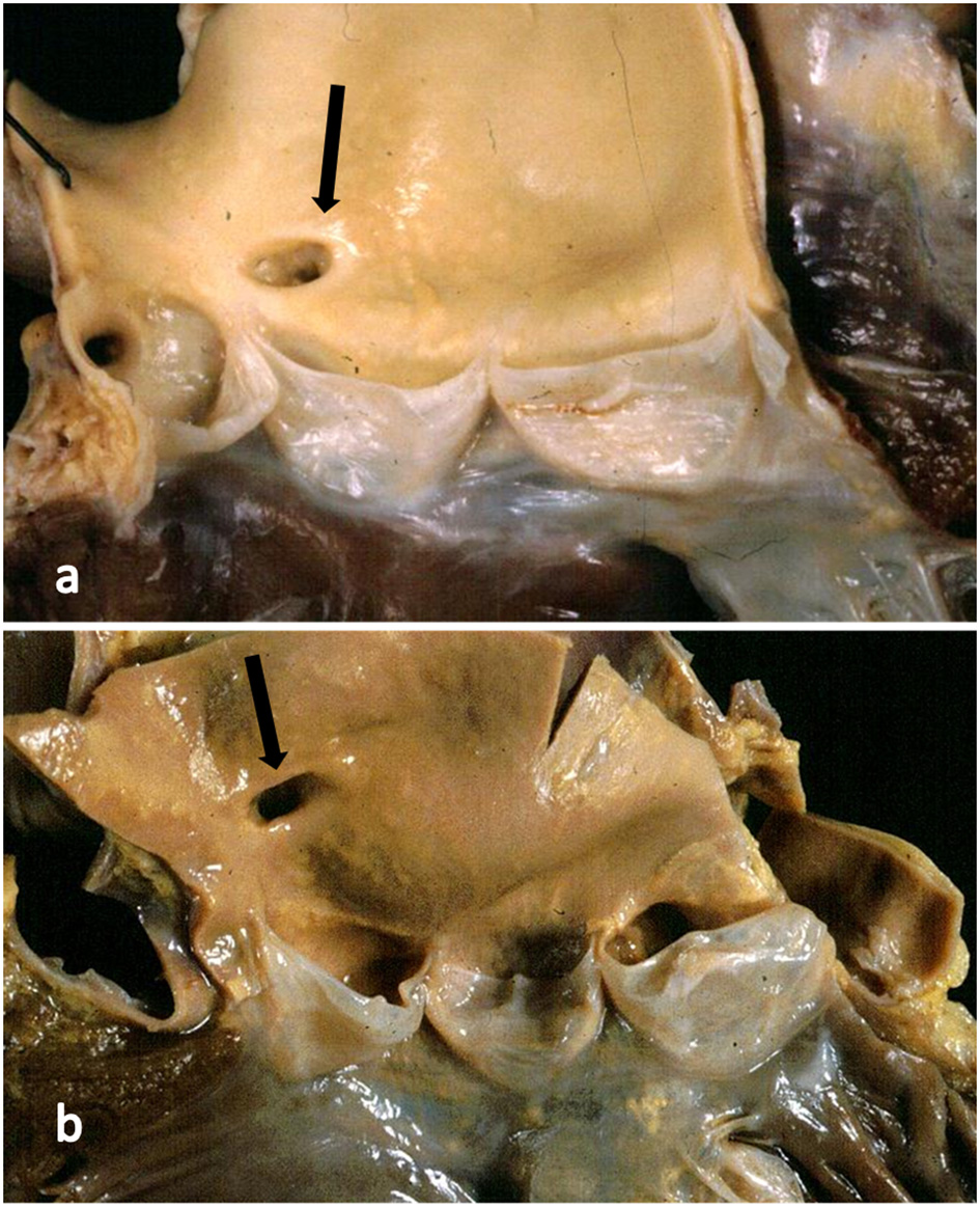Figure 4. (a) The right coronary artery orifice (arrow) is just above (2 mm) the sinotubular junction, within normal limits. (b) The right coronary orifice (arrow) is well above the sinotubular junction (10 mm), over the threshold of normal limits.