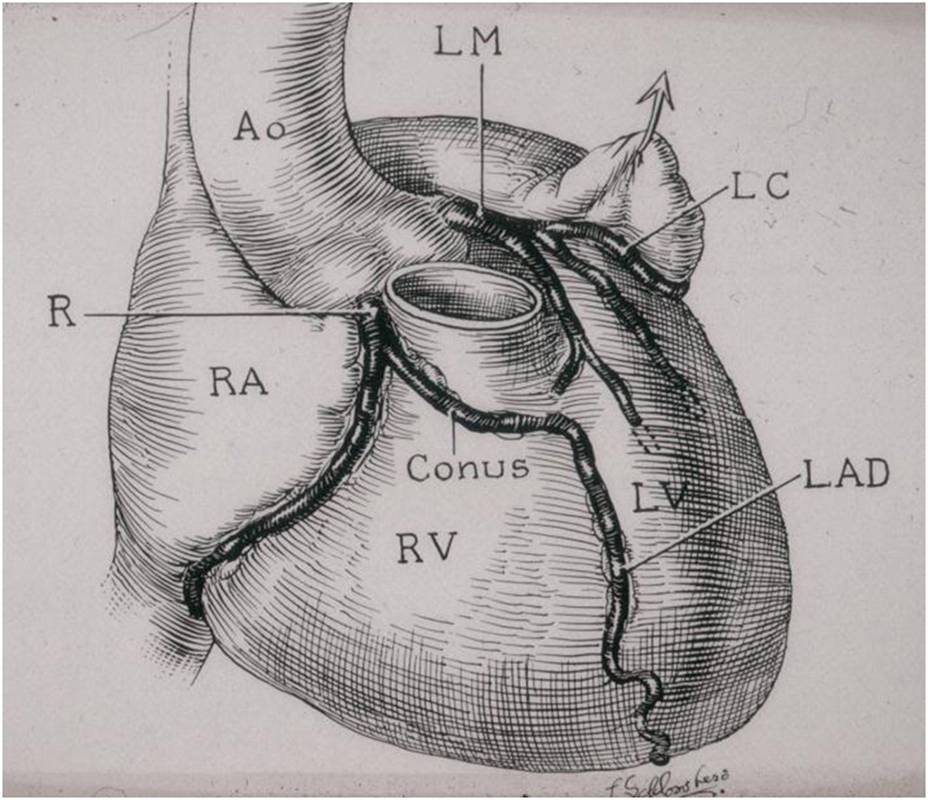 Figure 5. The coronary arteries arise from the facing aortic sinuses, perpendicular to the aortic wall, and the pulmonary root does not interfere with their proximal course. Note the left stem dividing into the left anterior descending (LAD) and the left circumflex (LC) branches. From Roberts (6).