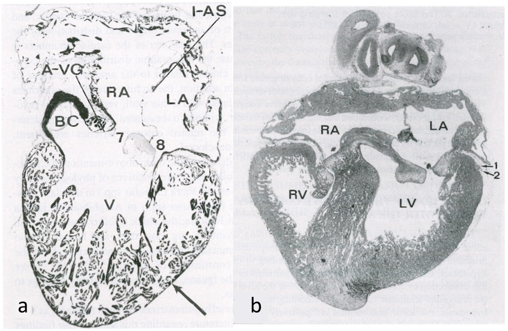 Figure 12. Embryology of the myocardium. (a) Spongy myocardium from a mature fog with blood supply deriving directly from the endocardium of the ventricular cavities. (b) The myocardium of a fetal chick heart becomes compact, with blood supply deriving from the subepicardial vasculature. From de la Cruz et al. (13).