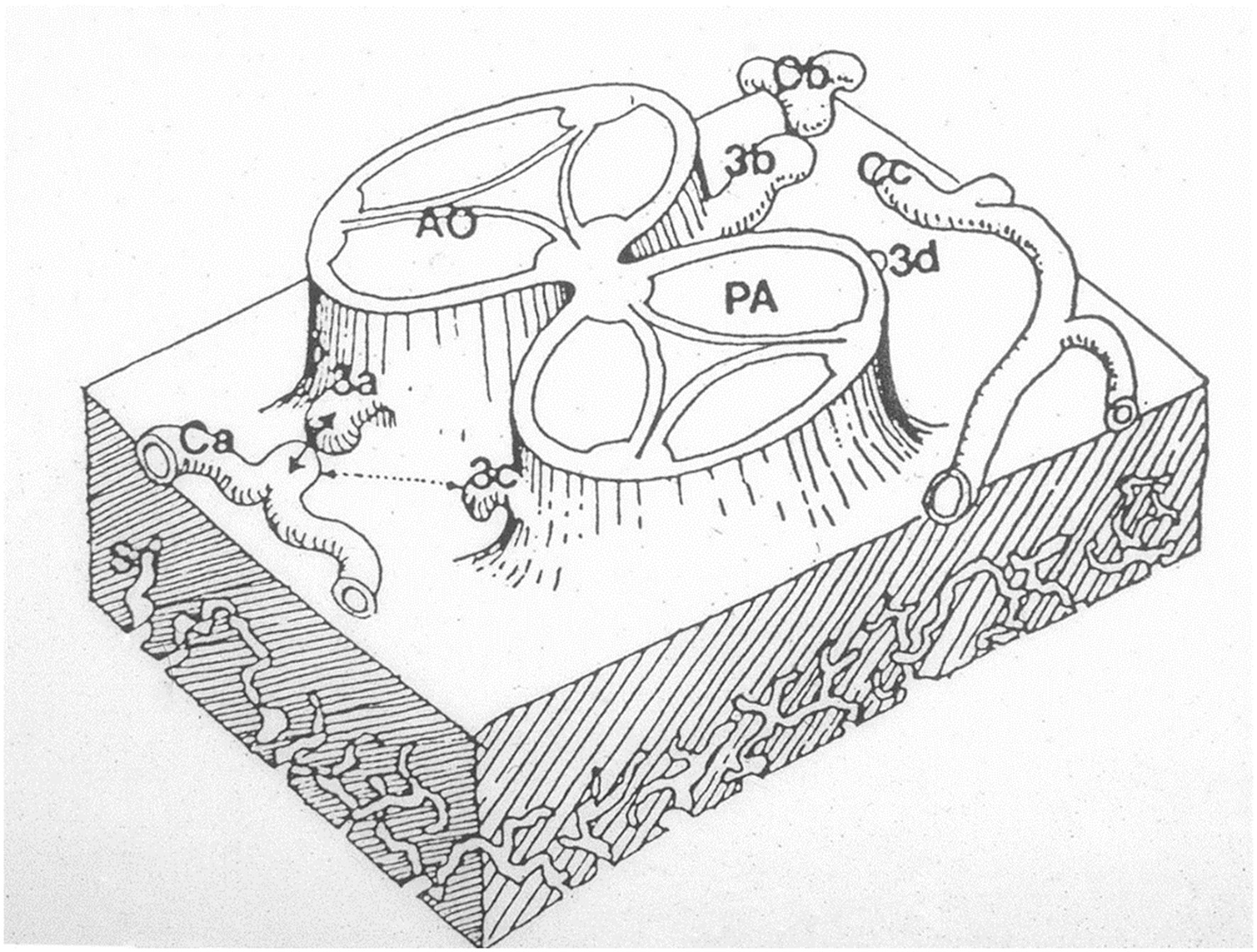 Figure 14. The hypothesis according to which sprouts or buds arise from the facing aortic sinuses and make contact with the subepicardial coronary vasculature. From Angelini (18).