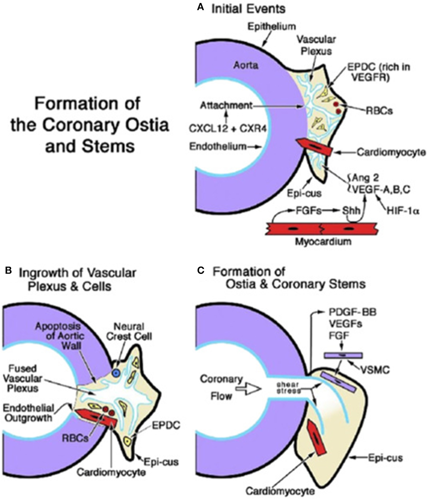 Figure 15. Embryology of coronary artery orifices and main stems. (A) Formation of the coronary ostia and stems is initiated when the capillary ring that encircles the aortic root expands and attaches as a vascular plexus (in response to CXCL12 + CXR4). The sites of ostial formation are adjacent to an epicardial cusp (Epi-cus), a thickened portion of the subepicardium that contains epicardium-derived cells (EPDCs) that are rich in Vascular endothelial growth factor (VEGF) receptors and erythroblasts [red blood cells (RBCs)]. Cardiomyocytes guide the attachment of the vascular plexus. Fibroblast growth factors (FGFs) from the myocardium promote Sonic hedgehog (Shh) signaling, which, together with hypoxia inducible factor-1 (Hif-1), stimulates VEGFs and angiopoietin (Ang) 2, thus facilitating angiogenesis of the vascular plexus. (B) Myocardium-derived cardiomyocytes and neural crest cells facilitate the entry of the vascular plexus into an opening in the aortic wall, created by apoptosis. An endothelial ingrowth demarcates the pathway of the ostium formation. (C) The onset of coronary flow and shear stress is key to the remodeling of the vascular plexus. Differentiation, migration, and attachment of vascular smooth muscle cells (VSMCs) are influenced by (1) platelet-derived growth factor (PDGF)-BB activation in endothelial cells and the ligand's interaction with PDGFR-β in VSMC progenitors; and (2) the influence of VEGFs and fibroblast growth factors (FGFs). From Tomanek and Angelini (20).