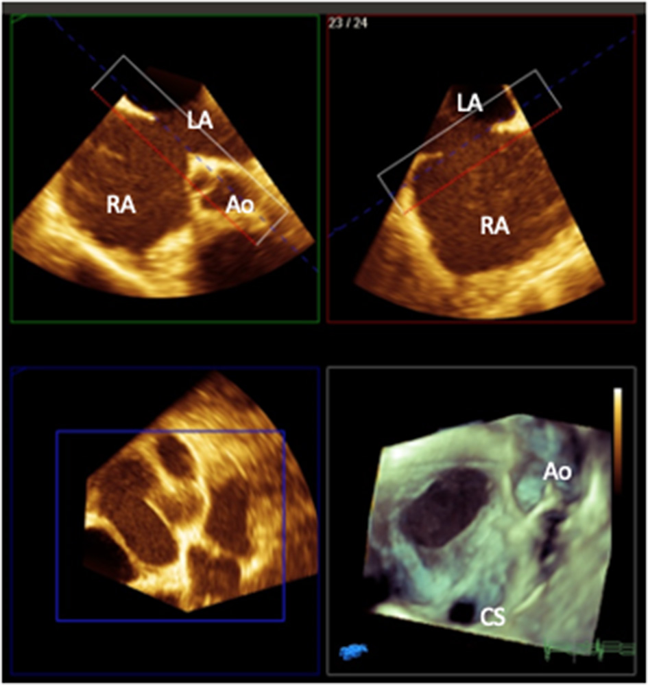 3D multiplanar reformat and rendered image (bottom right) of a transesophageal image of a secundum atrial septal defect with a deficient aortic rim as viewed from the right atrial aspect (Ao, aorta; CS, coronary sinus; RA, right atrium; LA, left atrium). Image courtesy of Alexandra Savis, Evelina London Children's Hospital.