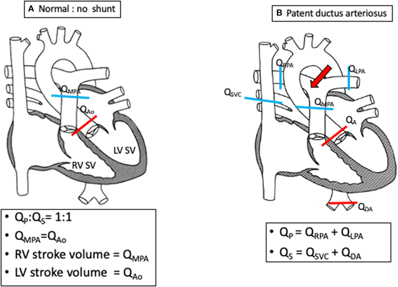 Schematics demonstrating shunt calculations (Qp:Qs) in a normal heart (A) and in a PDA (B) using flow quantification from cardiac magnetic resonance imaging.