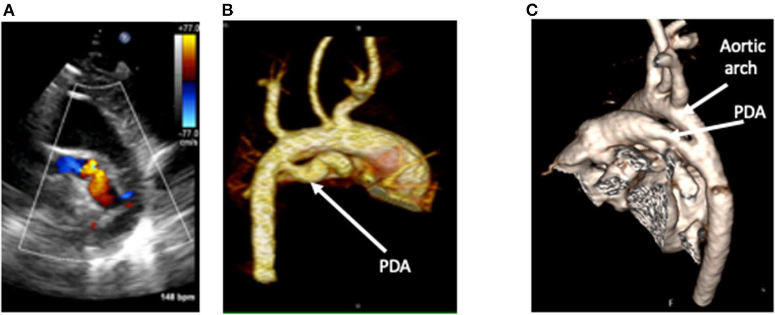 A tortuous duct as seen on 2D color Doppler echocardiography (A), with clear delineation of the shape, dimensions, and insertion points on contrast-enhanced CT (B). This is in comparison to a straight duct seen on CT in image (C). CT Images courtesy of Dr. Sujeev Mathur, Evelina London Children's Hospital.