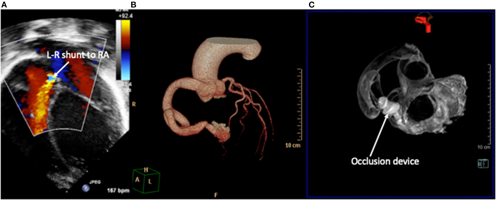 Coronary artery fistulae or coronary cameral fistulae are an abnormality of coronary artery termination into a chamber of the heart. This can involve any coronary artery and exit sites into any cardiac chamber and have multiple feeding vessels and multiple drainage sites (48). Symptom severity depends on the degree of shunt and left- or right-heart overload. Two-dimensional echocardiography is an effective screening tool, and the origin and exit are more easily seen. The course of the defect, bends, turns, and areas of narrowing are more difficult, but dimensions of fistula can be estimated on 2D imaging. Functional assessment includes volume load, function, and estimation of the severity of the shunt. Of all (21/24), 87.5% were correctly and accurately diagnosed by echocardiography (49). The interventionalist will aim to occlude the fistula artery as distally and as close to its termination point as possible, so as to avoid any possibility of occluding branches to the normal myocardium. Where these patients previously needed invasive coronary angiography to provide detailed diagnosis, cardiac CT is the preferred imaging modality and can be used to produce 3D models to the evaluation of suitability for interventions (31) (Figure 6) to help define the site, size, and potential landing zone for the occlusion device(s) without risk of embolization or occlusion of important coronary connections.