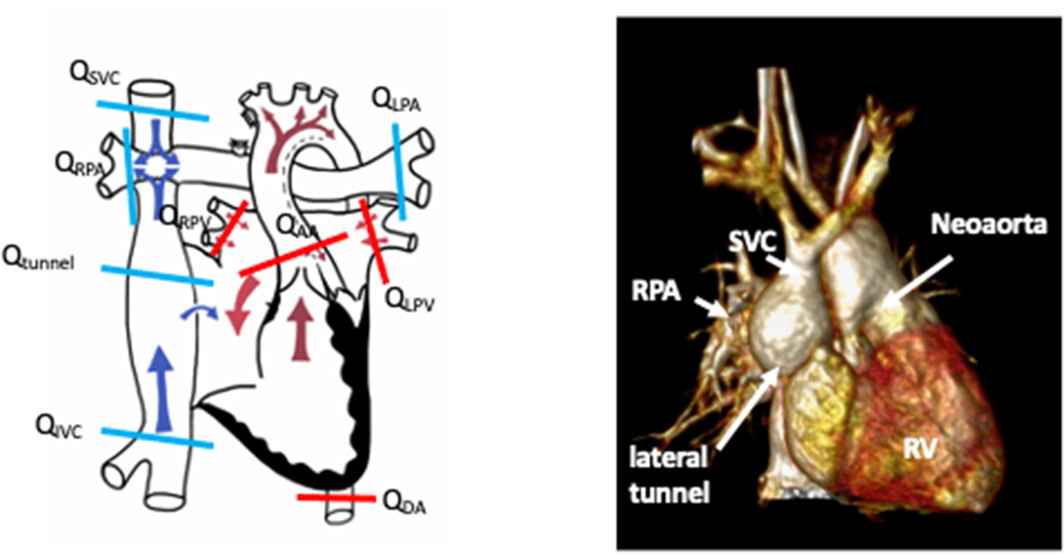 Schematic demonstrating sites of flow measurement in a lateral tunnel Fontan circulation by phase contrast CMR to facilitate shunt calculations. Schematic drawing courtesy of Dr. Aaron Bell, Evelina London Children's Hospital. The accompanying figure is a rendered 3D whole-heart image of a patient with a Fontan circulation for hypoplastic left heart syndrome. SVC, superior vena cava; RPA, right pulmonary artery; RV, systemic right ventricle.