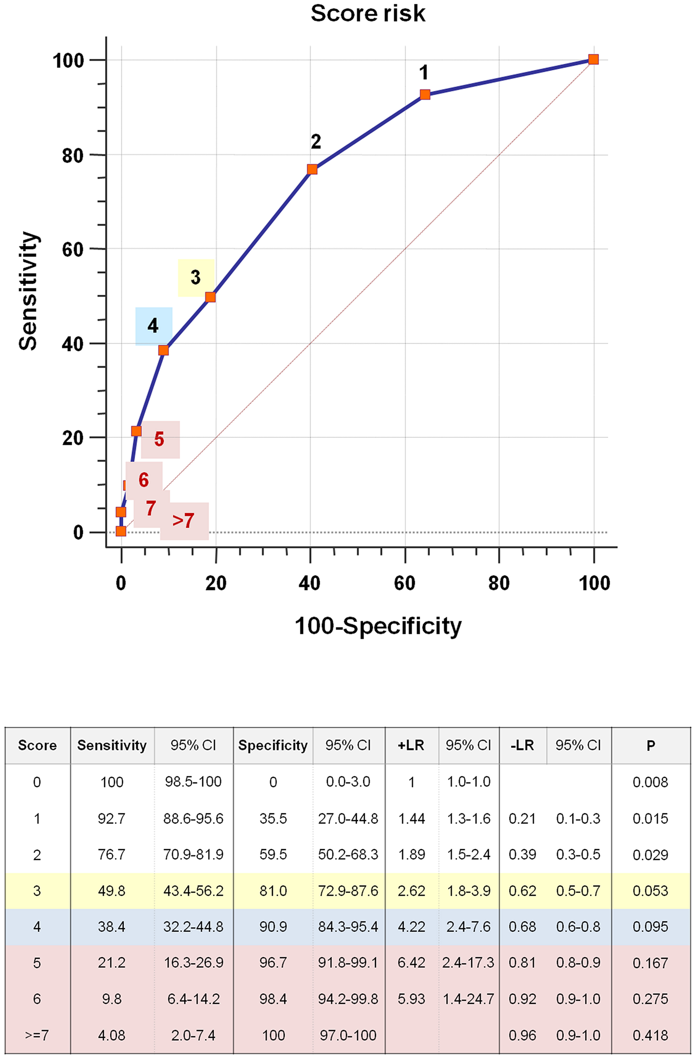 Logistic regression analysis was used to estimate the association between risk factors and the outcome (stroke) (42). The model discrimination was quantified using an area under a receiver operating characteristic (ROC) curve and the agreement between predicted and observed probabilities using the Hosmer-Lemeshow test. The intercept used to estimate the ischemic stroke risk was adjusted for the prevalence of ischemic stroke in the general population (43). A scoring system was created based on the regression coefficient. Different score values were evaluated in terms of sensitivity, specificity, likelihood of positive and negative ratio with their corresponding confidence intervals (44, 45).