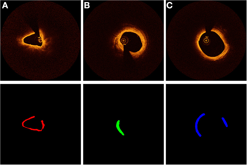 Cardiovascular disease remains to be the leading cause of morbidity and mortality globally. Acute events, such as heart attack and stroke, are usually triggered by the development of plaque rupture/erosion and subsequent thrombus formation. It has been shown that plaque components and morphology are the main factors in the determination of plaque stability (1–3). A coronary plaque normally consists of three different tissue types: fibrous, calcified, and lipid-rich, with mixed forms appearing in many cases. Plaques that have a large lipid core and a thin fibrous cap are more prone to rupture, whereas plaques containing calcification tend to be stable (4). Therefore, to prevent the acute cardiovascular events, it is crucial to develop strategies to characterize plaque morphology and components so that the vulnerable plaques can be identified at an early stage to reduce the risk of rupture. Based on the analysis of the reflected light, optical coherence tomography (OCT) has a high resolution. Its axial resolution can reach to 12–18 μm (5), which is a promising diagnostic technique in interventional cardiovascular imaging. High-resolution cross-sectional images of coronary artery can be seen via OCT, which allow us to observe the plaque components and morphology directly and distinguish different plaque types. The expert consensus document indicates that the fibrous tissue appears as uniform high-signal regions, the calcified tissue appears as uneven, low-signal regions with clear boundaries, whereas the lipid tissue is the low-signal region with blurred boundaries in OCT (6). In current clinical application, vascular lumen segmentation and characterization of plaque components are performed manually, which is laborious and time-consuming. Moreover, the accuracy is dependent on the experience of the observers. Therefore, developing a fast, accurate, and reliable method for an automatic characterization of atherosclerotic plaque composition is crucial, which can reduce the time and cost of analyzing data and avoid human interference errors, and thus can improve risk assessment of patients with coronary artery diseases.