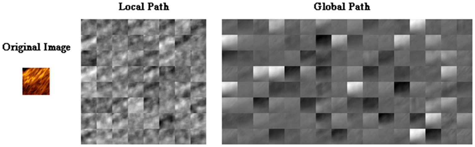 The activations of convolutional layers in the local path and the global path from a randomly selected patch. The activations can take any value, so the value is normalized to the range from 0 to 1 for visualization. Here, white pixels represent a strong positive activated region and black pixels represent a strong negative one. The channel is mostly gray if it does not activate as strongly on the original image.