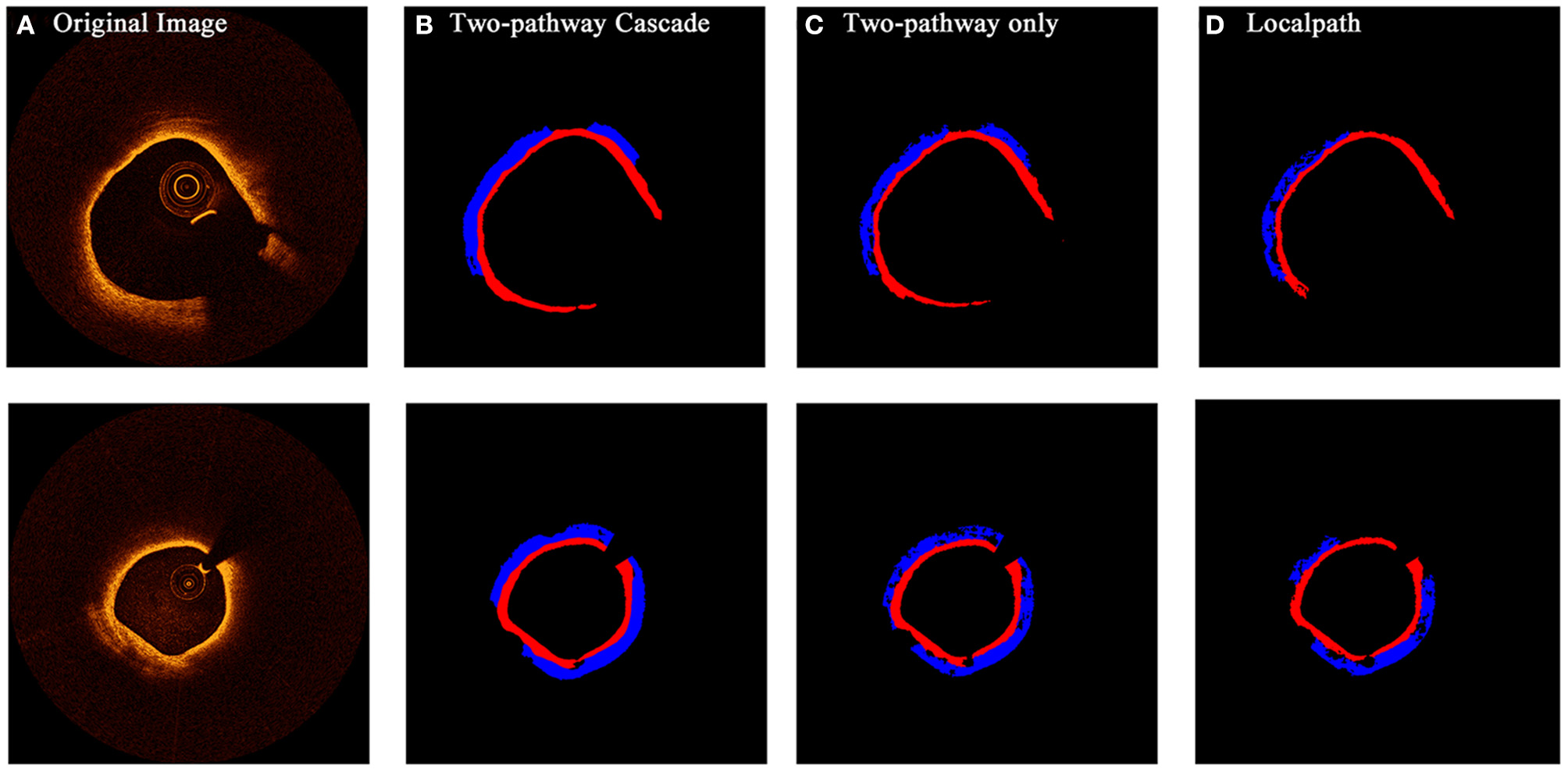 The prediction results of OCT images with fibrous caps by different types of networks. Rows (A–D) show the initial OCT image, prediction by TwoPathCNN network with cascaded structure, prediction by TwoPathCNN only, and prediction by LocalPath, respectively. Different colors represent different plaque composition: blue: lipid, red: fibrous.