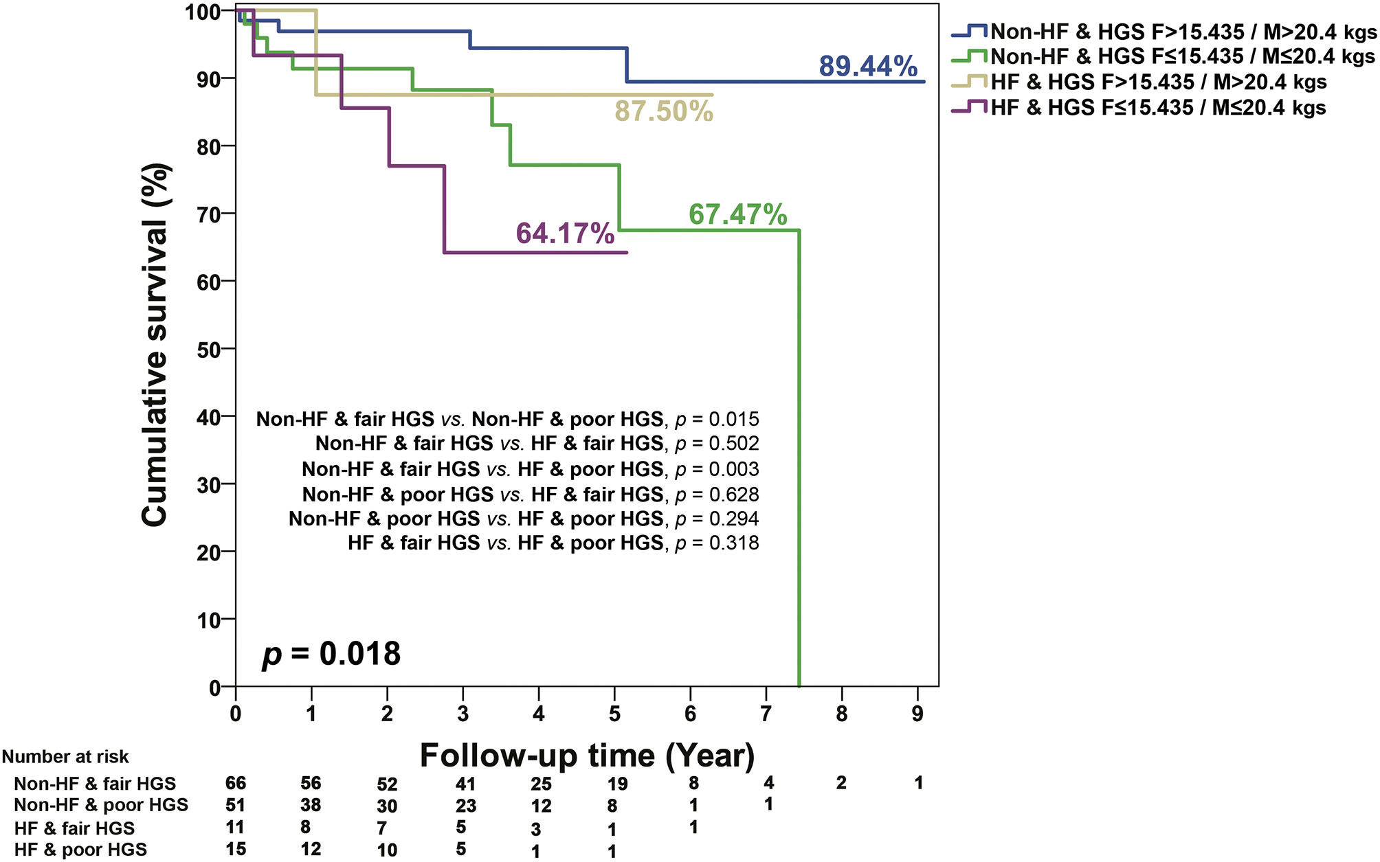 In terms of baseline characteristics of CKD survivors and non-survivors, non-survivors had a relatively longer TUG, significantly poorer HGS, and significantly higher Rockwood frailty scores [median (quartiles) = 34.3 (25.0–43.9) vs. 27.8 (18.8–35.3); Table 4]. In addition, non-survivors in CKD patients also had lower levels of serum LDL, albumin, and eGFR. More of them also received medications of diuretics, MRA, β-blocker, and digoxin (Table 4). When those patients were grouped into the combined HF and frailty status, 77 were HF and frail, none was HF and non-frail, 169 were non-HF and frail, and 85 were non-HF and non-frail (Table 4). During the follow-up period [median (quartiles) = 3.1 (1.1 to 4.7) years], a univariate Cox regression model (Table 5) showed that in CKD stages 4 and 5 compared with stage 3A, the continuous and discrete values of HGS were significantly associated with all-cause mortality. In the multivariate Cox proportional hazards model, poor HGS [model 1, Table 5, adjusted hazard ratio (aHR) = 0.91, 95% CI 0.84–0.99] and HFrEF (aHR = 4.78, 95% CI 1.26–18.11) were significantly associated with all-cause mortality after adjusting for age/gender, a heart condition, and different stages of CKD. When HGS was divided into categorized values (model 2, Table 5), those with low HGS (female ≤ 15.435 kg / male ≤ 20.4 kg) had a significant risk for all-cause death (aHR = 3.47, 95% CI 1.15–10.42). Patients of CKD stage 5, when compared with stage 3A (aHR = 3.84, 95% CI 1.51–9.75) and high Rockwood frailty score (aHR = 1.04, 95% CI 1.01–1.07), were associated with high patient mortality (model 3, Table 5). When patients were stratified into subgroups with and without HF and Rockwood frailty and abnormal physical functionality (HGS, TUG, 6MW), it was shown that HF patients associated with decreased HGS had the poorest survival, followed by non-HF patients with decreased HGS, HF with fair HGS, and non-HF patients with fair HGS, respectively (p = 0.018; Figure 1). However, there were no additive effects between HF and frailty, TUG, or 6MW on survival (Supplementary Figures 1A–C).